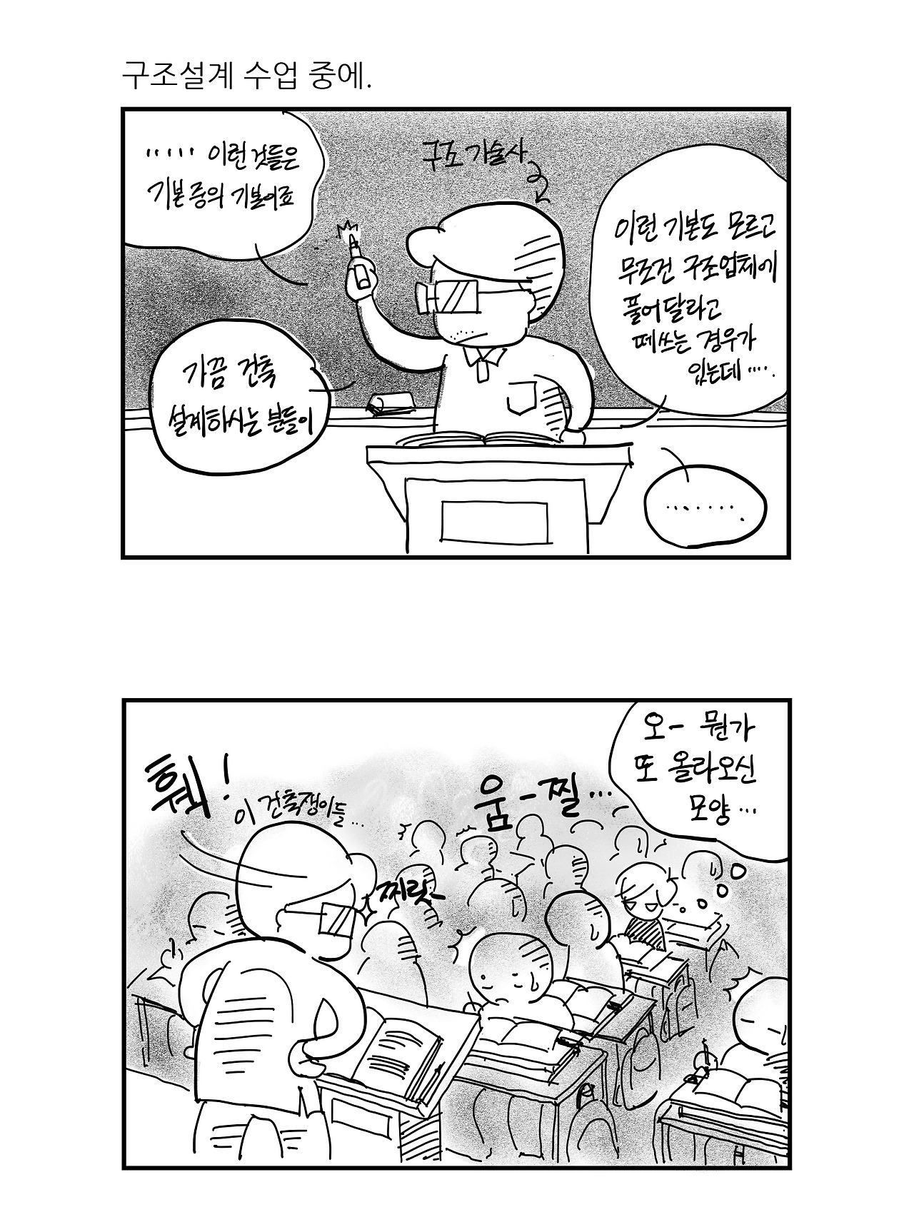 비록 건축사 시험의 점수 또한 아쉬운 결과로 끝났지만, 설계쟁이가 그간 궁금해했던 구조 설계의 기본 원칙이라던가 이론을 접할 수 있었다는 점에선 어느 정도의 해갈을 했다고 생각한다. 저연차 때는 어쩌다 구조 도면을 접할 수 있었던 기회가 없어, 건축기사를 따기도 할 겸 구조 및 시공 과목을 공부했던 적이 있었다. 그 때 암기해던 이론들은 대부분 실물 지식이 되지 못한 채 머릿 속에서 소멸됐지만, 아주 몇 가지 기본적인 구조 지식은 남아 구조도를 조금 읽을 수 있게 되었다.