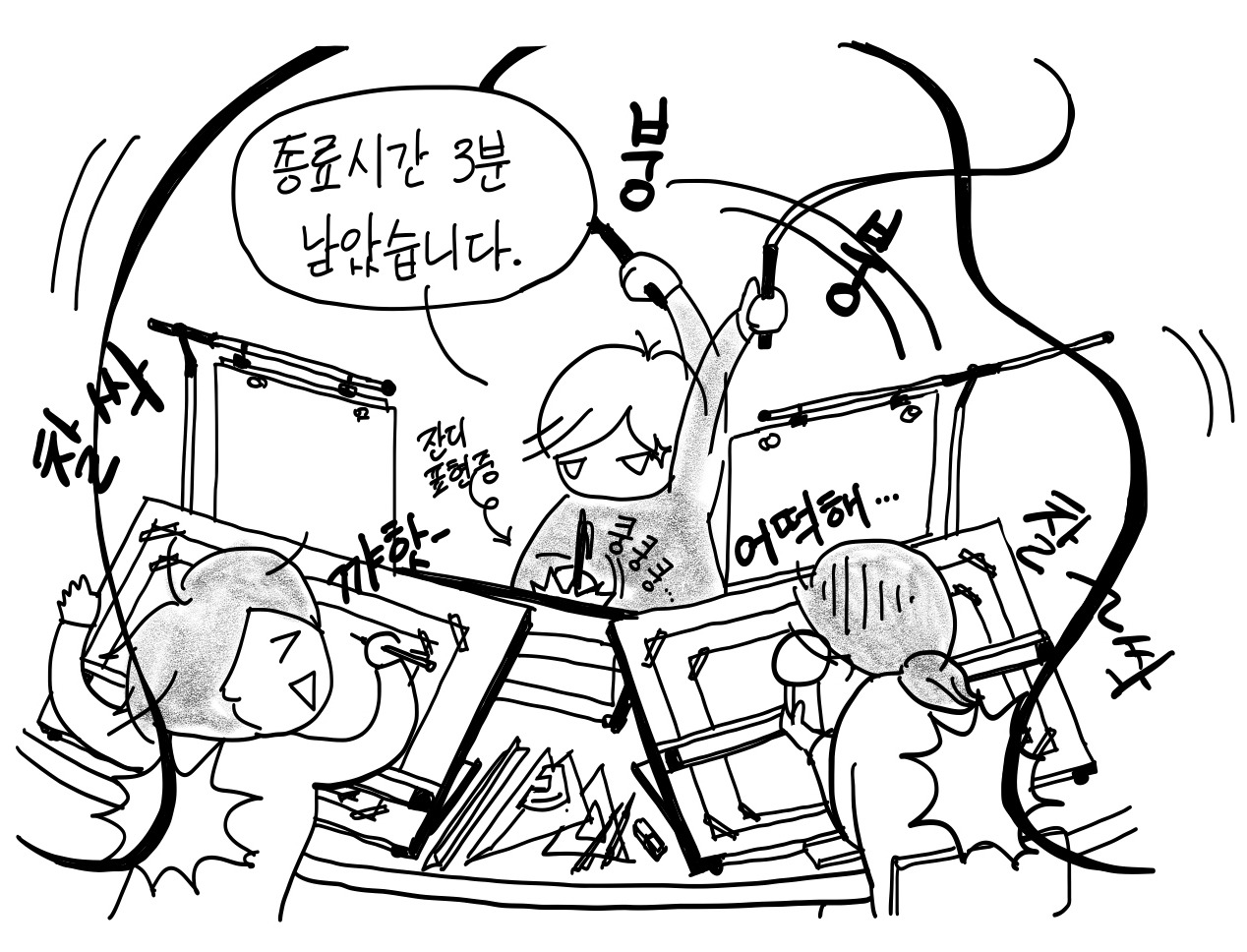 모임을 재개하던 두 번째 해는 나는 한 과목만 준비하면 되어서 상대적으로 여유가 있었다. 두 언니가 두 과목을 푸는 동안 혼자 1교시 학원 숙제를 하나 더 풀곤했다. 풀이가 끝나면 언니들 한 것을 같이 보며 코멘트를 해주기도 했다. 선이 불분명합니다, 가선은 연하고 빠르게 그리세요, 프로세스대로 푸세요, 시간을 좀 더 들여서라도 지문을 꼼꼼히 읽어보세요, 허투루 넘어가면 안 됩니다. 이 때가 아니면 언제 또 하늘 같은 선배님들께 꼰대질을 하겠는가. 나는 기회를 놓치지 않고 넓고 든든한 두 선배의 등짝에다 열심히 채찍질을 했다.