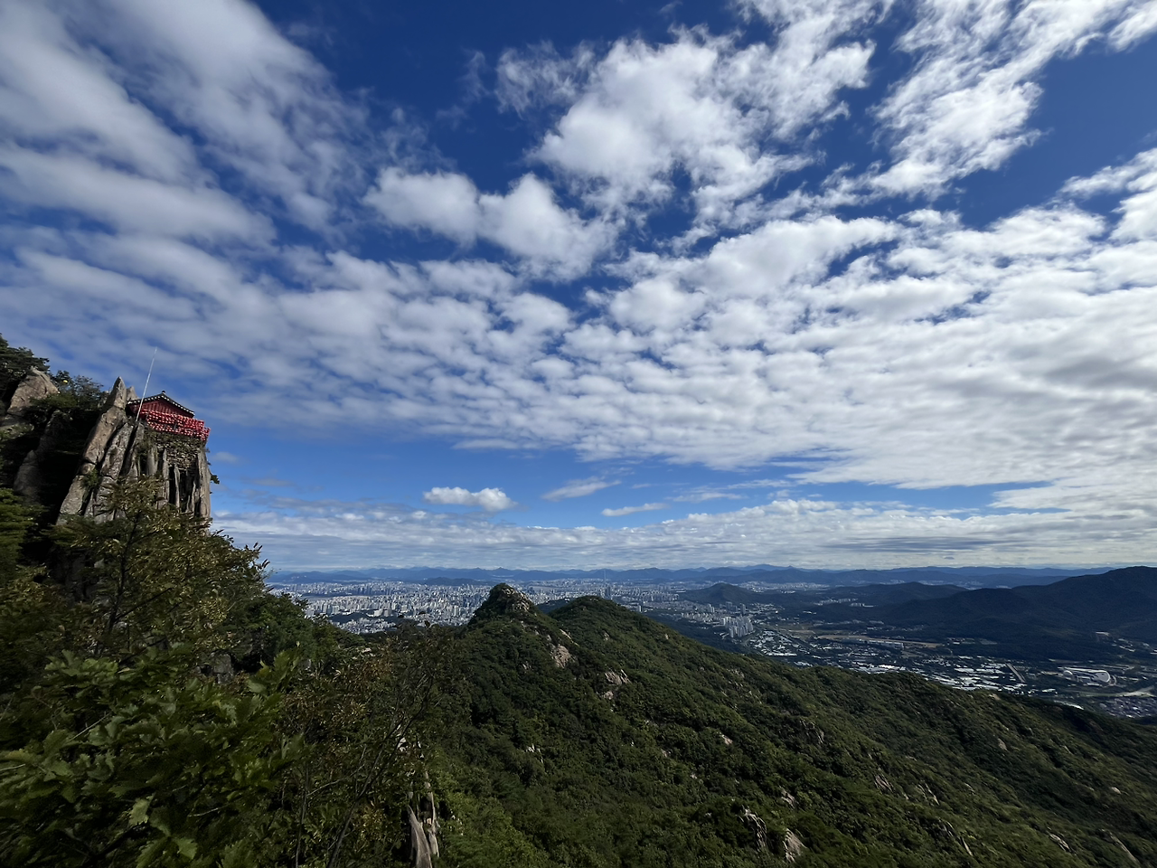 시야가 달라지는 경험은 꽤나 특별하다. 특히 내가 머무는 곳을 내려다보게 되었을 때. 사소한 일들이 정말 사소한 일들이라는 것을 눈으로 확인하게 된다. 다시 올라간다. 도시가 점점 멀리 내려다보이는 것을 확인하며 내가 서 있는 곳의 높이를 가늠한다. 정상 도착. 연주대. 해발 629m. 정상은 거대한 화강암 고깔을 쓰고 있다. 그 위에 안테나 탑과 천문대가 앉아 있고, 깎은 듯한 절벽 위에 절도 있다.