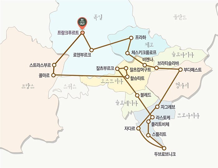 여행사 홈페이지에서 긁어 온 여행 루트. 중간중간 숙박만을 위해 머문 도시는 또 빠져있기도 하고, 그날 그날 저녁에 볼 일정을 당겨 아침에 보기도 했다. 11박 12일 일정에 8개국 (일정에는 안 나와 있지만 보스니아 땅도 밟았으니 9개국) 이라니... 정말 기함할만한 빡센 스케줄이었음은 분명하다.