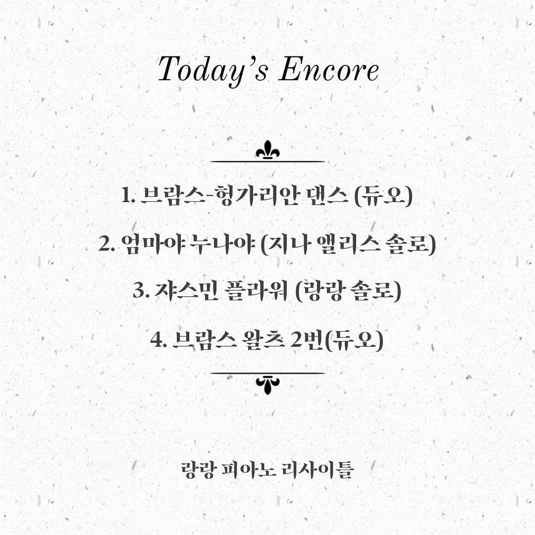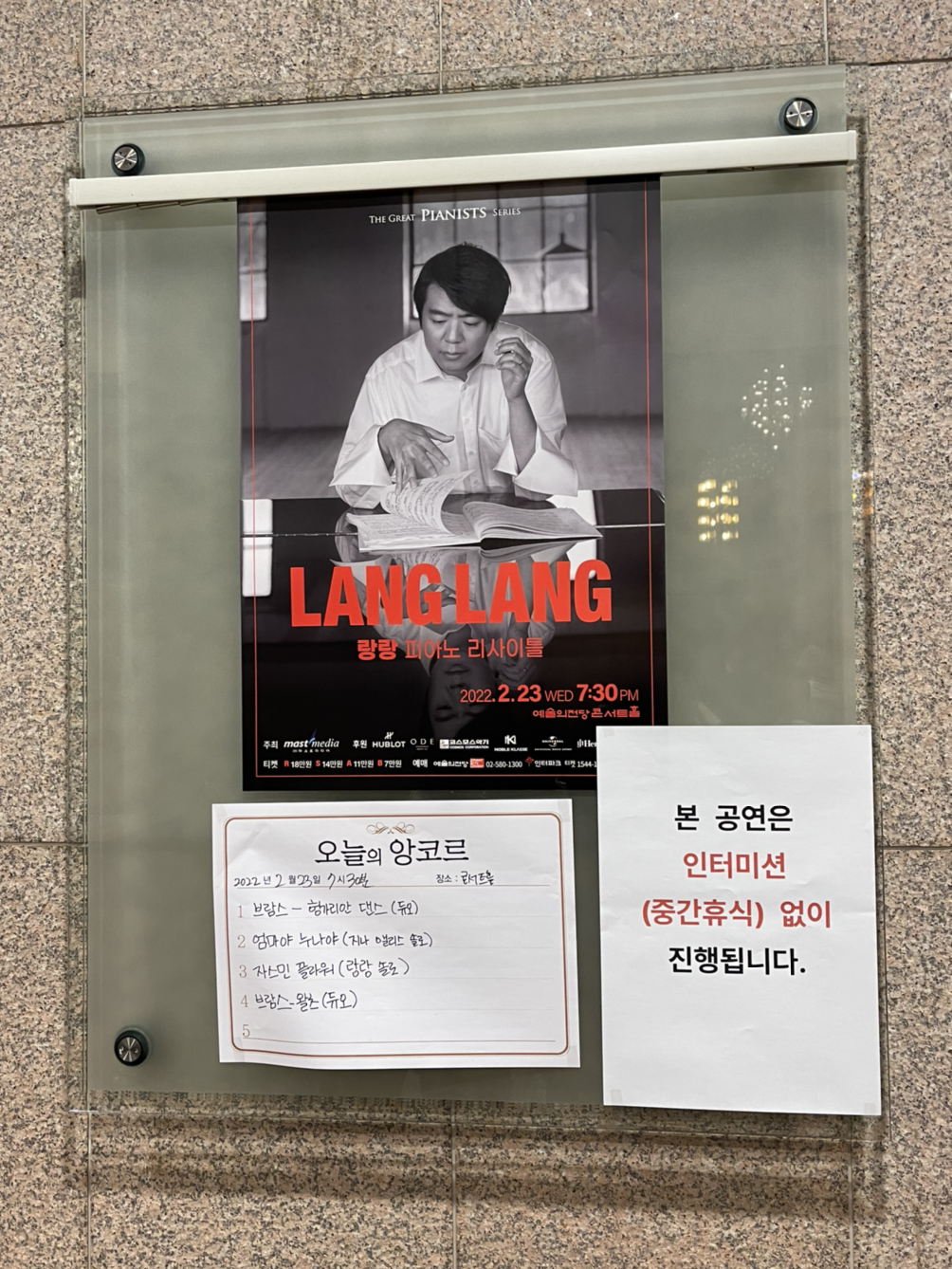 결론적으로는 앙코르도 좋았다. 아니 본 공연보다 앙코르 임팩트가 너무 커서 본 공연이 어땠는지 공연 끝난 직후에는 본 공연의 여운이 남아있지 않았다. 사랑스러운 연인 한 쌍이, 서로를 바라보며 협주를 하고, 눈을 맞추고 호흡을 맞추는 모습이, 그들의 손에서 빚어지는 음악이 보기 좋았다. 로베르트 - 클라라 슈만 부부의 환생이라 하더라도 믿을 수도 있을 것 같았다. (잠시만요, 슈만은 9살 연하인데 랑랑은 12살 띠동갑 연한데요? 랑랑이 더 한 도둑놈 아닌가요? ㅋㅋ) 각자가 서로의 뮤즈가 되어주고 그로 인해 서로가 성장해 갈 모습이. 지나 알리스의 솔로곡 <엄마야 누나야>의 편곡 버전을 연주하는데 합창석 아래 벽에 기대어 아내의 연주를 뚫어져라 쳐다보는 눈빛이, 눈에서 발사되는 하트가, 조명 밖 어둠 속에서도 보일 정도였으니... (랑서방. 그러니까 알리스한테 잘해.) 창작자라면 누구나 꿈꾸는 이상적인 관계라 생각할 연인의 모습, 부부의 모습을 그들에게서 볼 수 있었다. (기승전 - 부러웠다. 심술심술) 뮤즈이자 조력자이자 아내이자 연인이자 제 아이의 엄마인 그녀로 인해, 랑랑이 얼마나 더 자신의 음악세계를 키워갈까 궁금해진다.