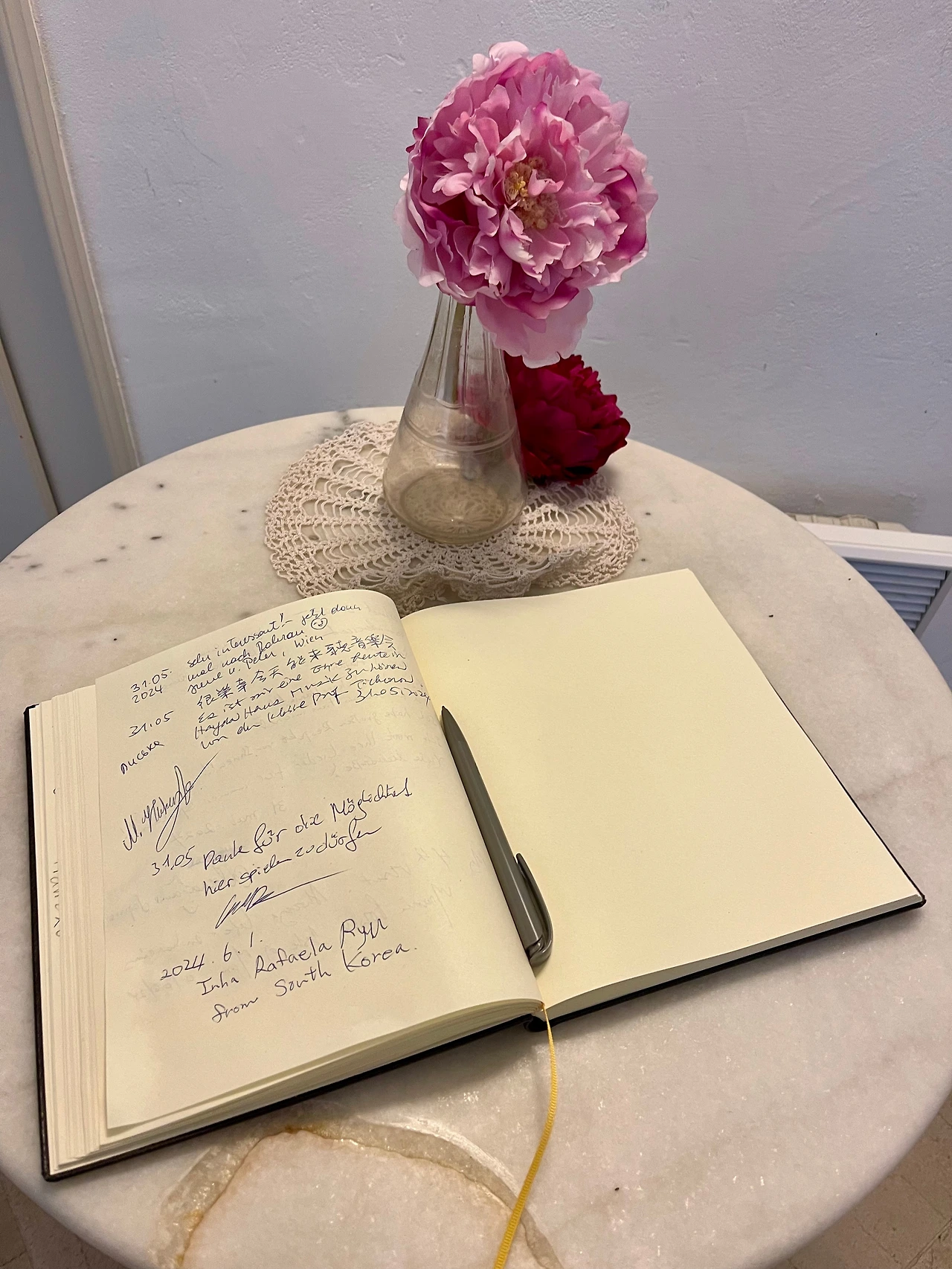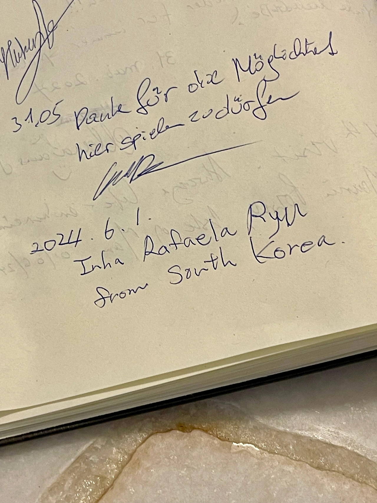에스테르하지 궁전 매표소 직원들도, 하이든 하우스 직원들도 다들 젊은 동양 여자 혼자 하이든 순례하러 왔다고 하니 굉장히 친절히 대해줬는데, 편하게 보고 가라고 엄청 배려해 줬다. 특히 방명록 꼭 쓰고 가라고 얘기해 줘서... (얘기 안 해줬대도 쓸 거였지만...ㅋㅋ) 원래 내 미들네임은 이탈리아어에서 응용한 ‘Raphaella’로 쓰는데, 독일어권이니까 독일어 방식으로 ‘Rafaela’라고 썼다.