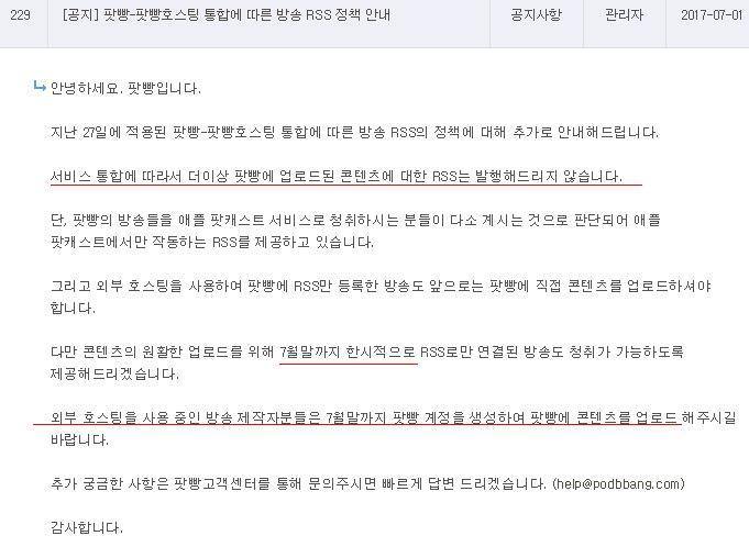 팟빵이 한국의 팟캐스트 시장을 키우는 데 공헌한 것은 인정한다. 하지만 수많은 제작자들을 서버와 그곳에 업로드해놓은 파일들로 볼모 잡고 이렇게 나오는 것은 갑질이라고 볼 수밖에 없다. 팟빵이 정말 시장에서 우위를 차지하고 싶었다면, 이런 갑질을 하지 말고 팟빵 플레이어에 대한 개선과 개발이 선행되어야 했다. 잦은 오류와 다운, 먹통... 휴대폰에 차지하는 큰 용량... 이런 것부터 개선하며, 팟빵에서만 들을 수 있는 독점적인 킬러 콘텐츠 발굴에 힘썼다면. 그랬다면 웹툰 시장처럼 유료화도 자연스레 진행되었을지도 모른다.