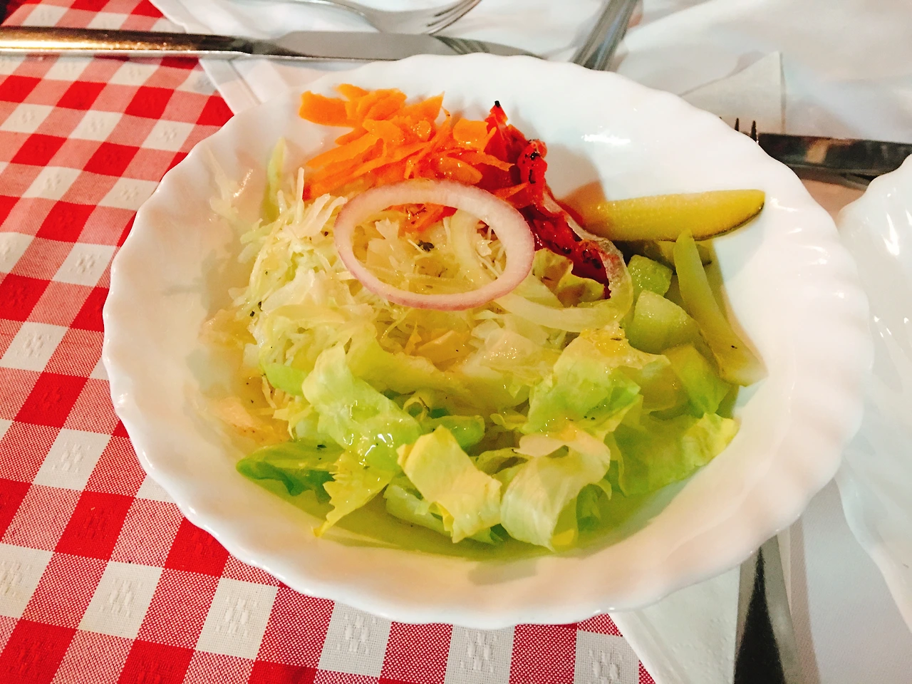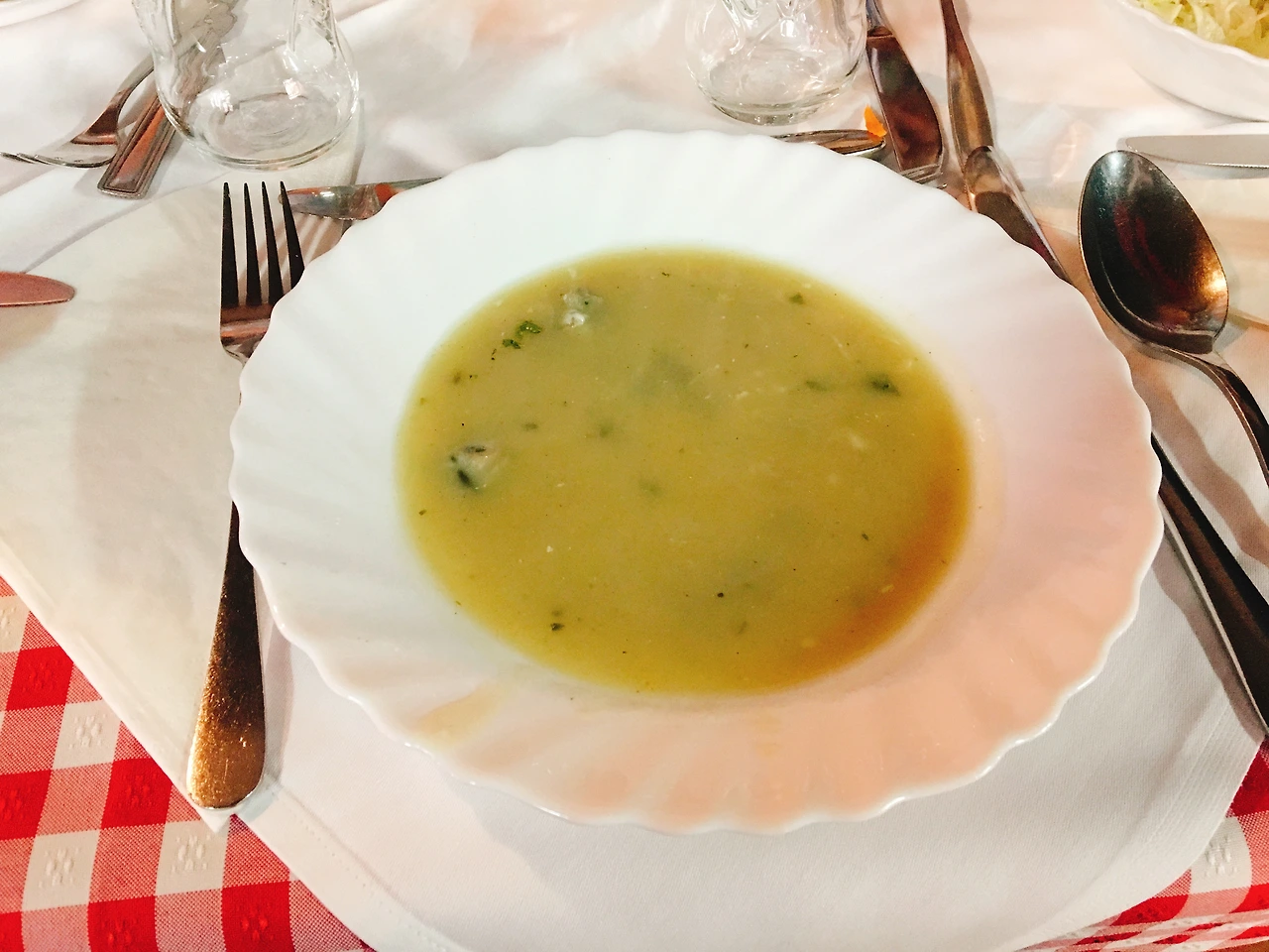 식전 수프로는 정체를 알 수 없는 조개 수프, 그리고 올리브유만 뿌린 샐러드가 나왔다. 그 흔한 발사믹조차 없는 샐러드... 수프는 짰고, 샐러드는 니맛도 내 맛도 아닌 무맛... 그래도 이렇게 채소가 많이 나오는 샐러드를 만난 지 오래되어서 맛있게 먹었다.