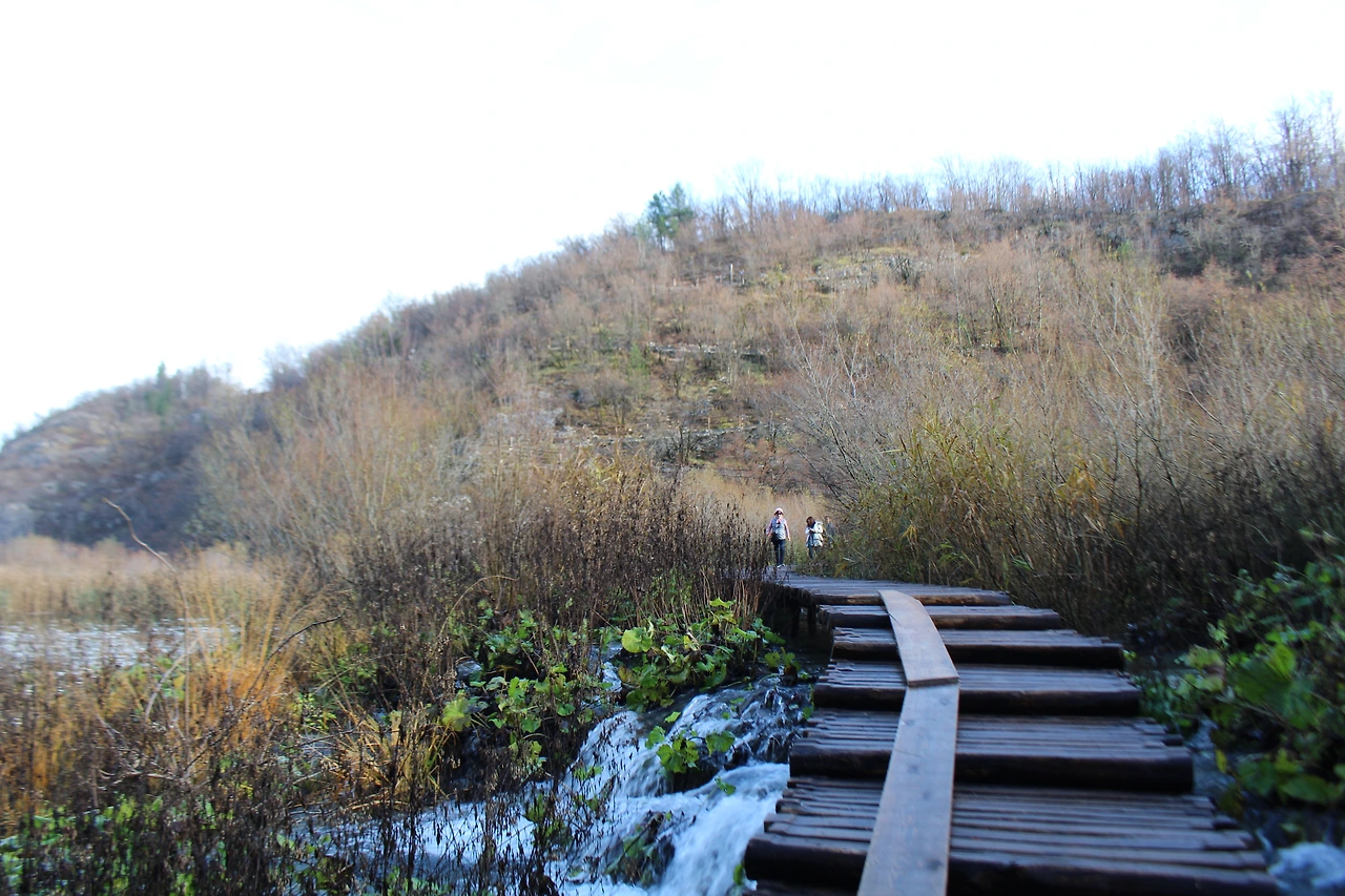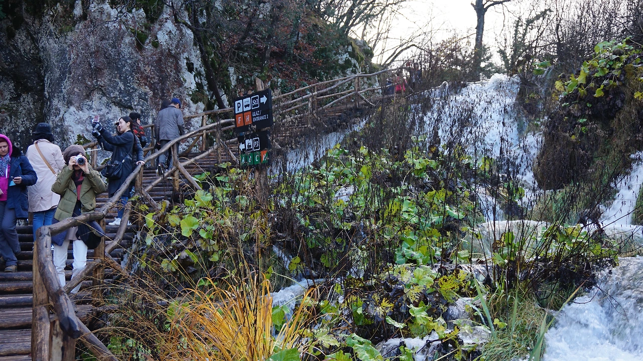 폭포를 지나 유람선 선착장으로 가는 길. 전날까지 비가 많이 왔는지 플리트비체 공원 곳곳에 물이 넘쳤다. 그리고 산책로까지 물이 넘쳐 산책로가 물에 잠기기까지 했다. 가뜩이나 좁은 산책로에 물이 들어와 불편한데 반대편에서 오던 중국 & 대만 관광객들 때문에 한동안 앞으로 가지 못할 때도 있었다. 더러 어떤 사람들은 신발과 양말까지 벗어버리고 맨발로 물에 잠긴 산책로를 지나가기도 했다. 나는 물을 피하려고 무척 노력했는데 결국 신발 바닥에서 물이 올라와서 신발이 쫄딱 젖어버렸다. 물이 많아서 아름답기도 했지만 한편으로는 무척 불편하기도 했다.