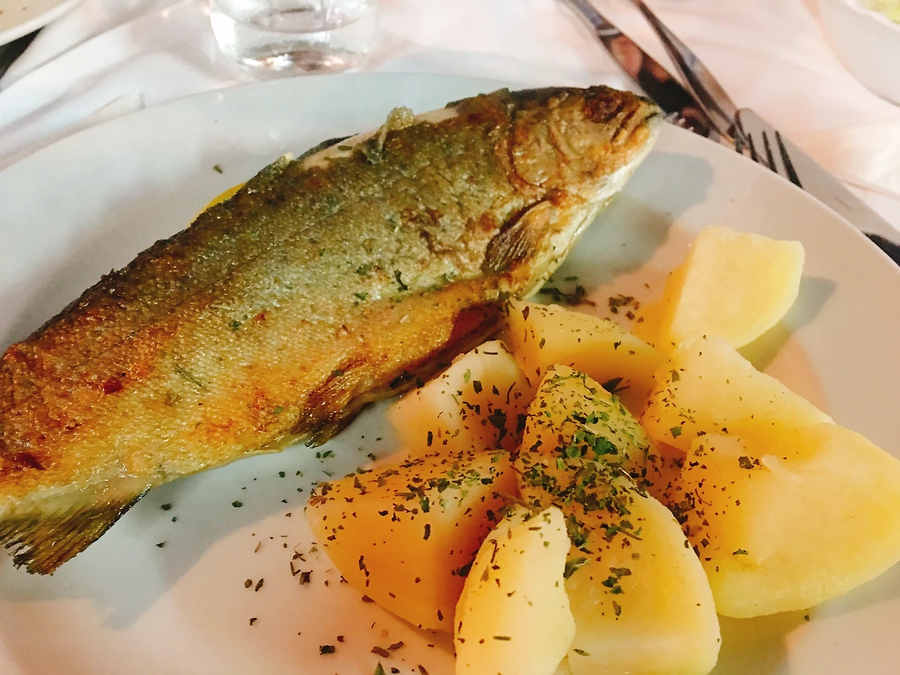 그리고 메인 메뉴인 송어!!! 와 삶은 감자가 함께 나왔다. 먹으면서 불편했던 것은... 가시가 너무 많아! 원래도 가시 바르는 게 귀찮아 생선구이를 잘 먹지 않는데 어쩌겠나. 주는 대로 먹어야지. 그나마 등과 배 부분의 가시를 먼저 제거한 후 생선살만 발라 먹고, 뒤편으로 뒤집어 먹으니 먹을만했다. 송어 구이가 좋았던 이유는 짜지 않고 담백했다는 점 정도?