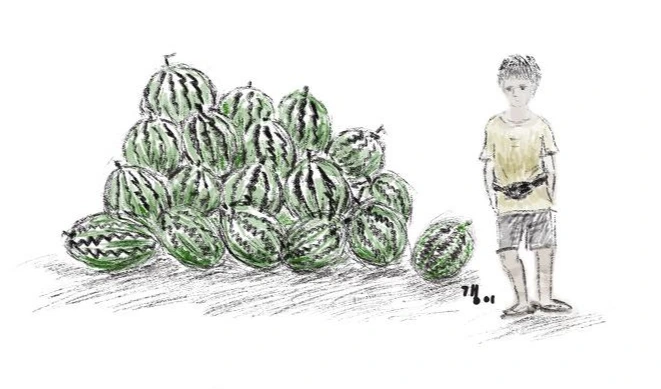 ‘통통, 툭툭, 탁탁’ 시장을 오가는 사람들이 머리통을 콩콩 쥐어박는다. 옆에서 지켜보던 꼬마 녀석도 엄마를 따라 한다. 이리 쥐어 박히고 저리 쥐어 박히다 골병들기 전에 팔려가는 수박, 시퍼런 얼굴에 검은 눈물이 줄줄 흘러내린다.