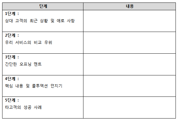 그렇다면 아래와 같이 표를 한 번 작성해 보는 것은 어떨까? 고객한테 전화하기 직전에 전화의 내용을 5단계로 구분하고 각 단계별로 체크 포인트를 적어 보는 것이다.