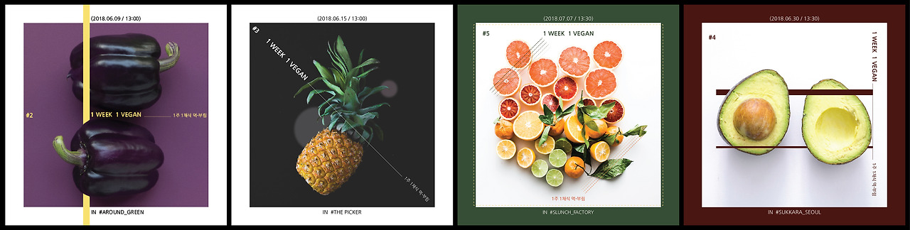 '1 Week 1 Vegan'은 1주에 1끼 비건식이라는 뜻이다. 1주일에 한 끼만 비건 음식을 먹어보면서 채식에 대한 막연한 거리감, 어려움, 무거움과 편견을 조금씩이라도 줄여나갈 수 있기를 바라면서 만든 프로젝트인데 생각보다 친구들이 많이 참여해주고 있다. 1주일에 1개씩 SNS에 작게 만든 포스터를 올리면 채식에 관심이 있고 비건 음식을 먹어보고 싶어 하는 친구들이 연락을 줘서 같이 식사하고 이야기하는 방식으로 진행하고 있다.