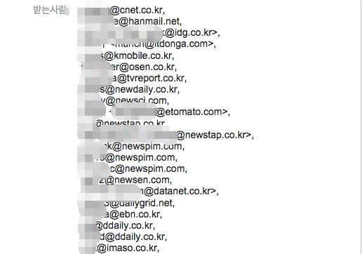 이제 보도자료를 다 만들었으니, 이메일을 써야겠습니다. 주의할 점이 하나 있는데요. 절대로 받는 사람에 이메일 명단을 때려박으면 안된다는 것입니다. 만약에 받는 사람에 이메일 목록을 넣는다면, 아래와 같은 일이 벌어집니다.