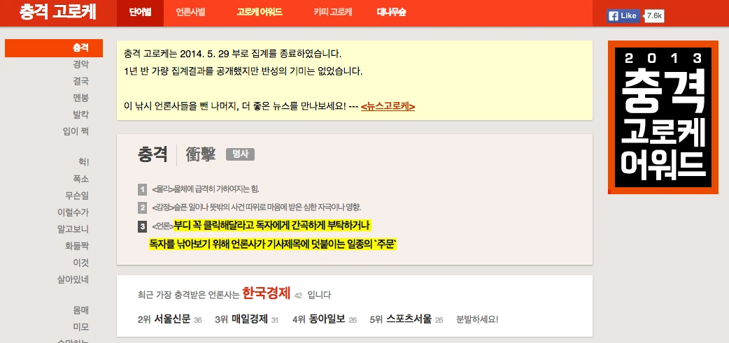 비슷한 일이 국내 미디어 업계에도 있었죠. 작년 5월로 종료한 '충격 고로케'라는 서비스가 있습니다. 인터넷 실시간 검색어(실검) 기사를 쓰는 기자들이 누리꾼들의 주목을 받고자 제목에 '충격'이라는 표현을 남발하는 것을 풍자하기 위해 만들어진 사이트였는데요.
