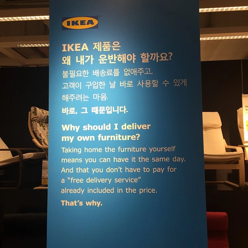 이들에겐 기업의 브랜드를 사람들의 뇌에 저장하고자 하는 욕구가 있습니다. 브랜드를 홍보하고, 마케팅하는 위치에서는 당연한 일입니다. 적어도 위의 이케아 배송문구를 본 사람들은 '뭔가 이상한데'라고 하면서 한 번 더글을 읽어보게 되지 않을까요. 그렇게만 된다면 반응이 어떻든 마케팅의 입장에서는 목적을 달성하는 셈입니다.