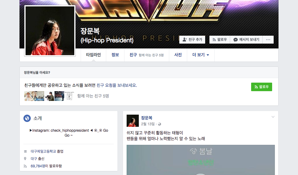 장문복은 이미 인플루언서나 다름없습니다. 슈스케 힙통령 이후 모든 온라인 커뮤니티에서 꽤 오랫동안 화제가 됐죠. 5년이 지난 후 LG유플러스의 CF에 출연했는데, 이 또한 주목을 받았습니다. 1분 30초짜리 클립 영상에 110만 뷰가 나왔죠. 현재 페이스북 계정의 팔로어는 7만에 가깝습니다. 훑어보니 최근 콘텐츠당 좋아요는 500~3000개에 이릅니다.