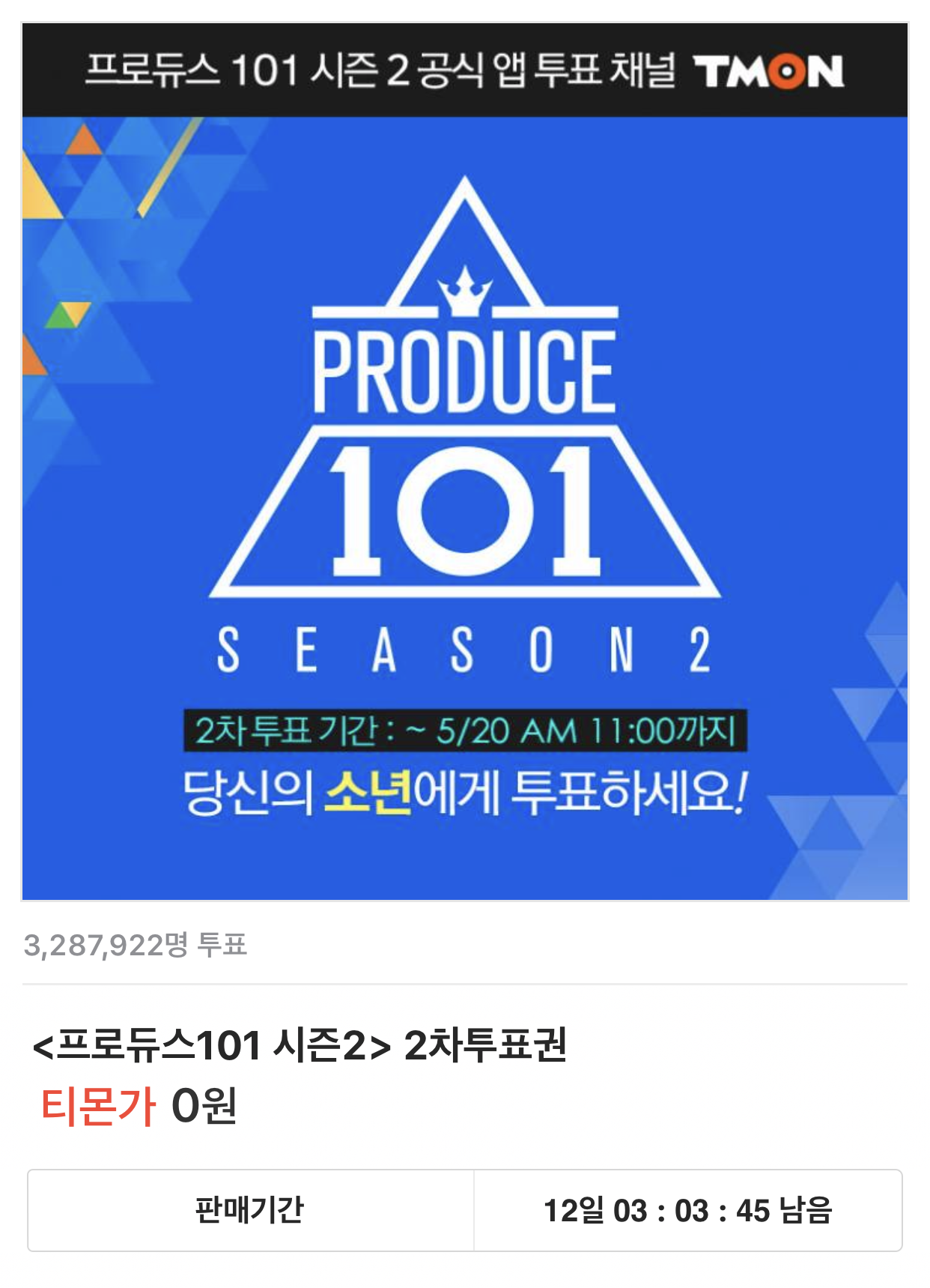 소셜커머스 티몬이 이번 프로듀스 101 시즌2의 공식 앱 투표 채널로 참여했습니다.