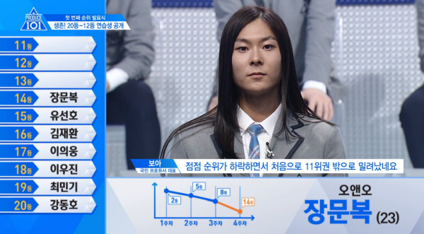 허나 장문복은 모두의 예상을 깨고 1회 방송에서 국민 프로듀서 투표 2위에 오르는 기염을 토해냅니다. 그의 1분 자기소개 영상은 당일 네이버 TV 톱 5에 오릅니다. 현재 기준으로 130만뷰를 넘어섰죠. 이후 5회에서 60위 미만은 탈락시키는 첫번째 순위 발표식에서 50만표 이상을 득표하며 14위를 기록했습니다.