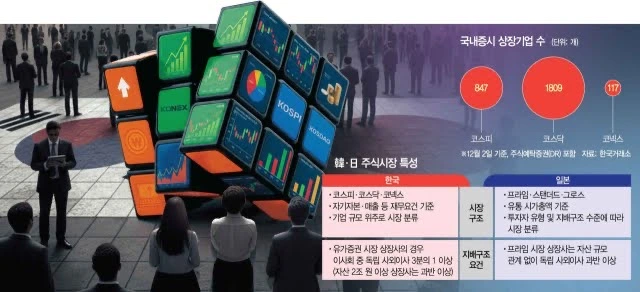 일본 도쿄증권거래소는 2022년 기존 5개 시장을 투자자 성격에 맞춰 프라임, 스탠더드, 그로스 등 3개 시장으로 개편했다.