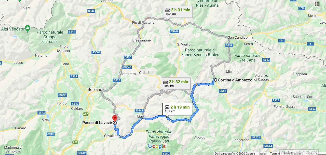 위 구글 지도에 표시된 이동경로를 참조하면 꼬르띠나 담뻬쬬 곁 지근거리에 뜨레치메가 위치한 것을 볼 수 있다. 그럼에도 불구하고 우리는 빠쏘 디 라바제로 공간이동을 하게 된 것이다.