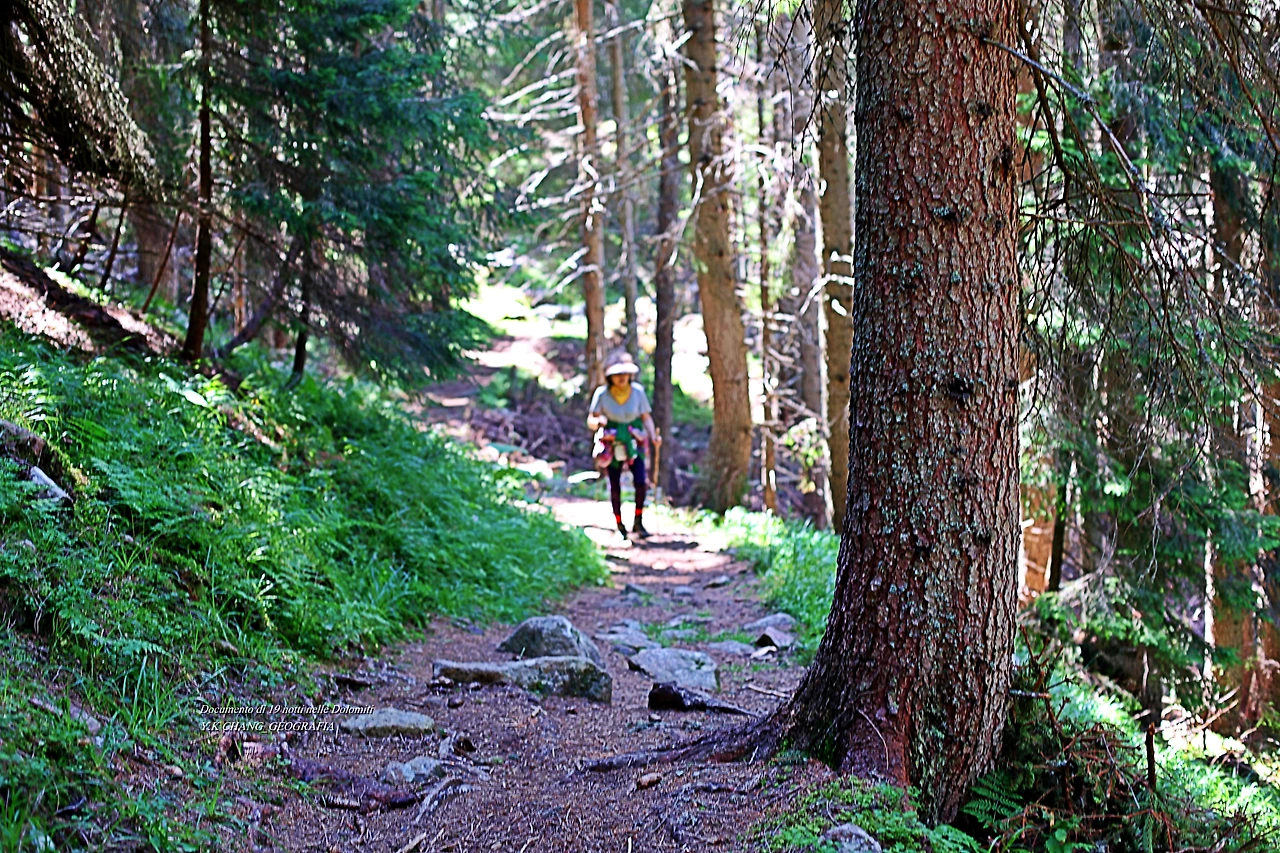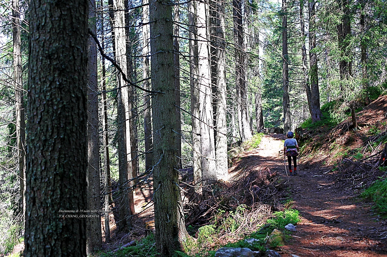 하니와 함께 빠쏘 디 라바제의 숲길을 트래킹 하는 동안 우리 곁을 지나간 사람들은 많지 않았다. 숲길을 전세 내고 우리만 다녀온 것 같은 착각에 빠질 정도로 산중을 구름처럼 휘돌아 산 중턱(대략 해발 2000미터)에 도착하니 저만치 돌로미티의 빠르꼬 나뚜랄레 몬떼 꼬르노(Parco Naturale Monte Corno) 봉우리들이 병풍처럼 둘러싸여 우리를 굽어보고 있었다.