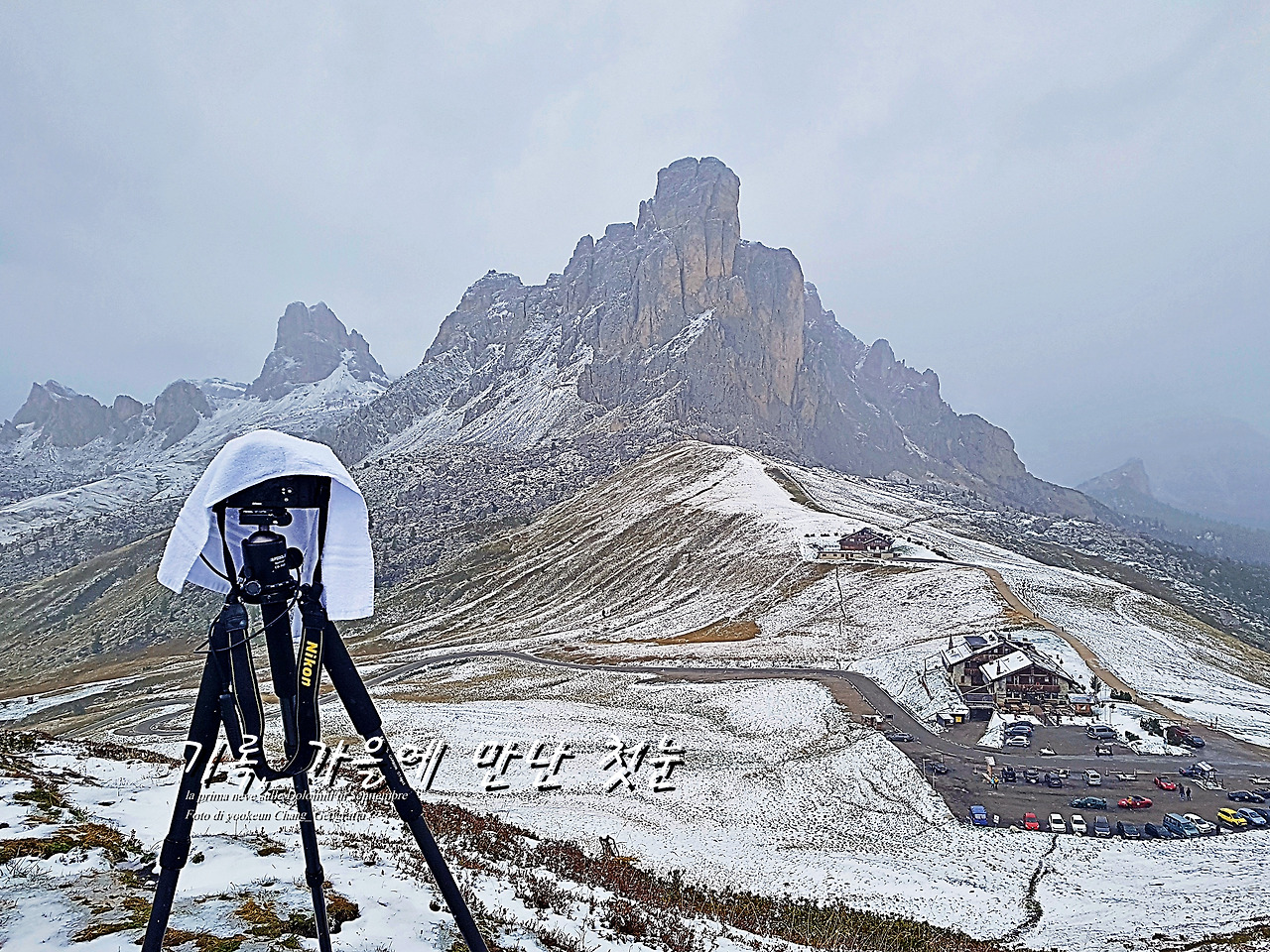 이날 다시 하늘은 찌푸렸고 우리는 오래된 철길 다리 아래서 하늘만 바라보고 있었다. 날이 개일 생각을 하지 않고 있었다. 그런데 이튼 날 놀라운 일이 벌어졌다. 이틀 동안 돌로미티를 흠뻑 적시던 가을비가 잦아들면서 먼산.. 우리를 굽어보고 있는 거대한 바위산이 꽃단장을 하고 있었던 것이다. 비를 퍼붓거나 우중충 하게 만들던 날씨는 돌로미티가 화장을 고치고 있었던 시간이랄까.. 9월에 첫눈이 내린 것이다. 너무 기뻤다!!