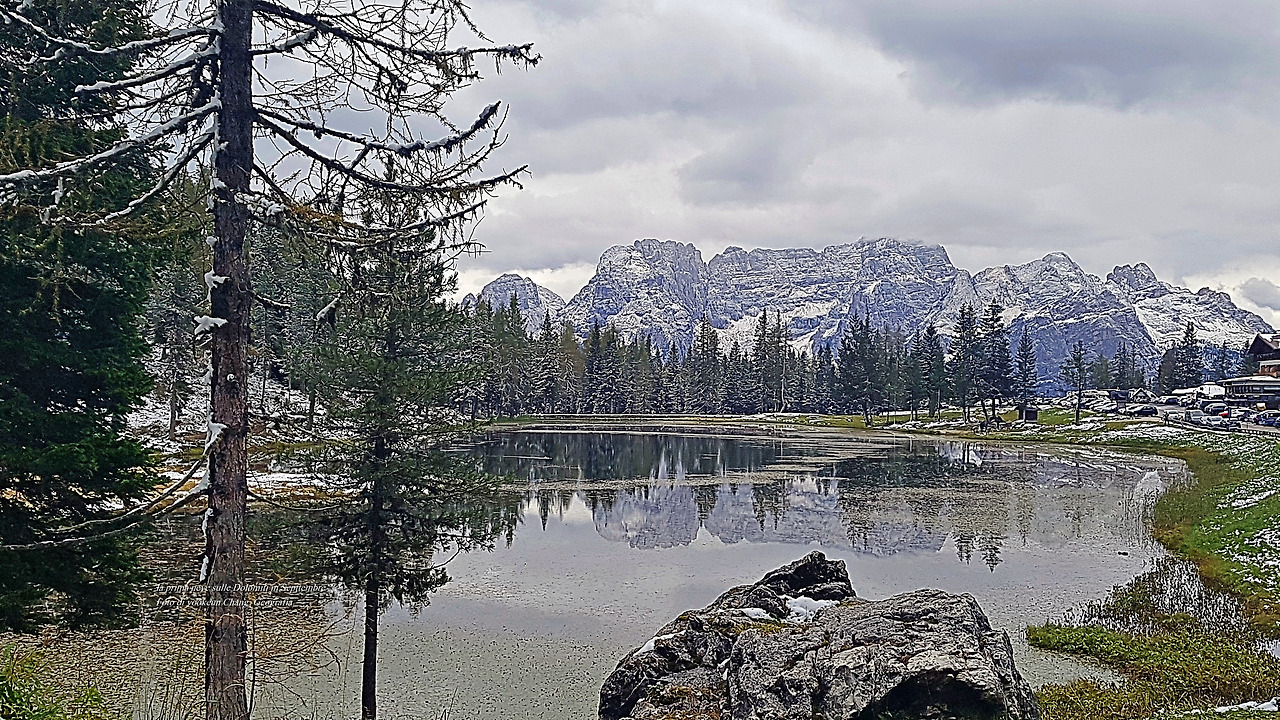 돌로미티의 명소 뜨레치메(Tre Cime) 가는 길에 만난 라고 안또르노(Lago Antorno)에 첫눈이 내려 선경을 만들었다. 잠시 무아지경에 빠진 곳이다. 촬영일시: 2020년 9월 26일 오후 1시 47분경