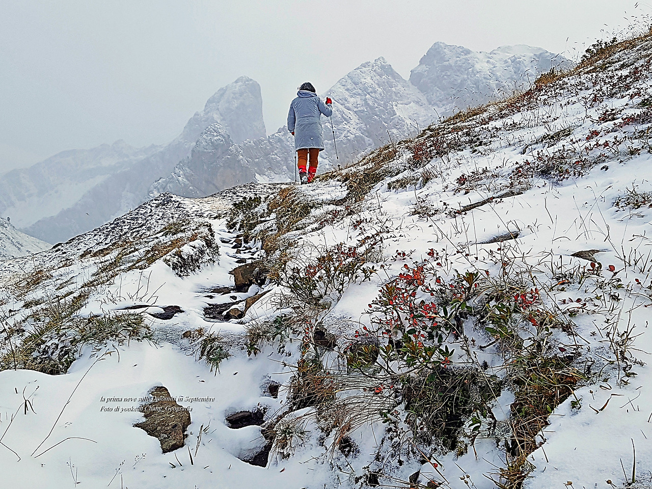 지난 8월에 다녀온 빠쏘 디 지아우(Passo di Giau)에 첫눈이 내렸다. 하니가 저만치 앞장서 그 길을 찾아 나섰다. 9월에 내린 첫눈으로 돌로미티의 가을이 눈 속에 묻혔다. 촬영일시: 2020년 9월 26일 오후 3시 53분경