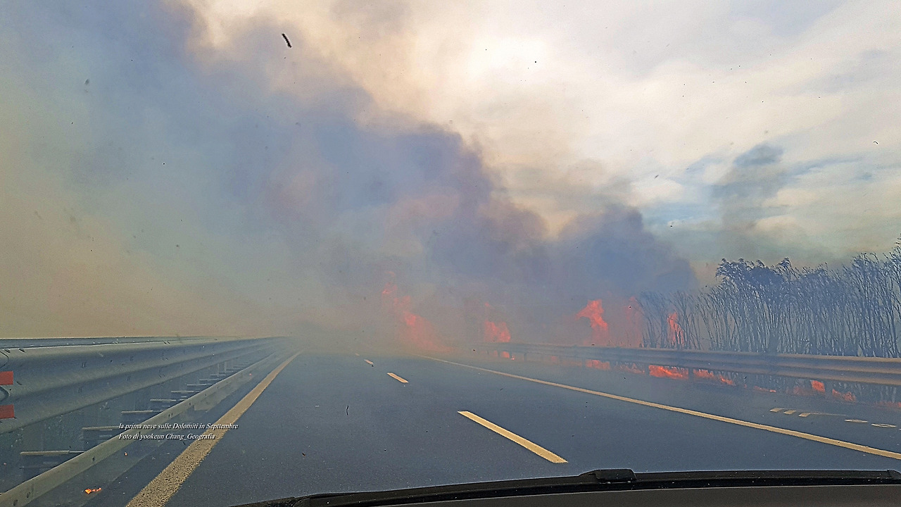 상황을 살펴보니 고속도로 곁에서 누군가 불을 질러 밭두렁을 태우고 있었는데 때마침 불어온 바람이 불길을 고속도로로 번지게 한 것이다. 고속도로 곁에는 조경수가 길게 이어지고 있었는데 불은 바람과 함께 조경수에 옮아 붙어 거센 불길을 뿜어내고 있었던 것이다. 자동차 문을 조금 열어둔 상태에서 매캐한 연기 냄새가 진동을 했다. 즉시 문을 닫았지만 자동차 안은 매캐한 연기로 가득했다.