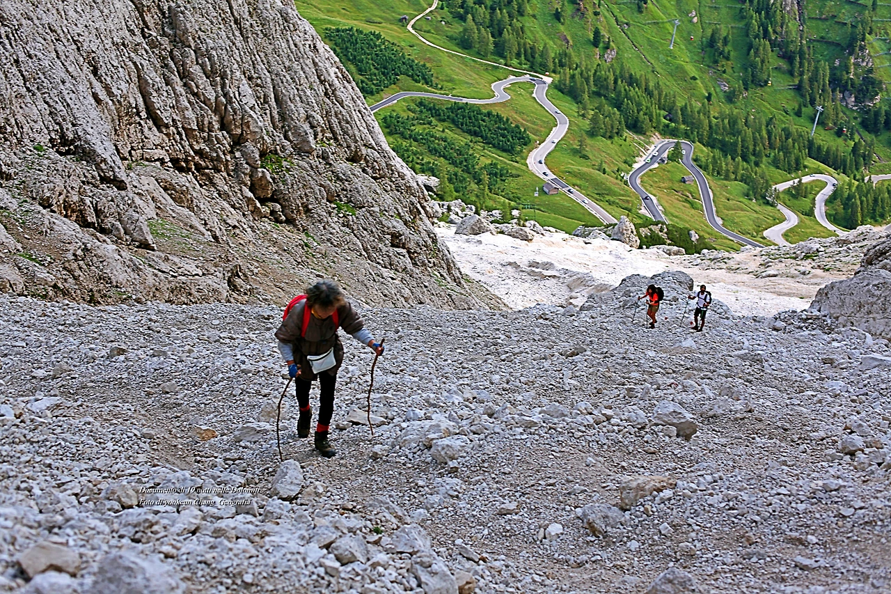 얼핏 보면 노란 양귀비들의 모습은 눈에 띄지 않는다. 그들은 각자의 자리에서 자기의 노래만을 부르고 있었던 것이다. 저만치서 우를 뒤따라 오는 청춘의 트래킹족.. 그 뒤로 우리가 묵었던 빠쏘 가르데나 고갯길의 용틀임이 여전하다. 점점 더 고도를 높인다.