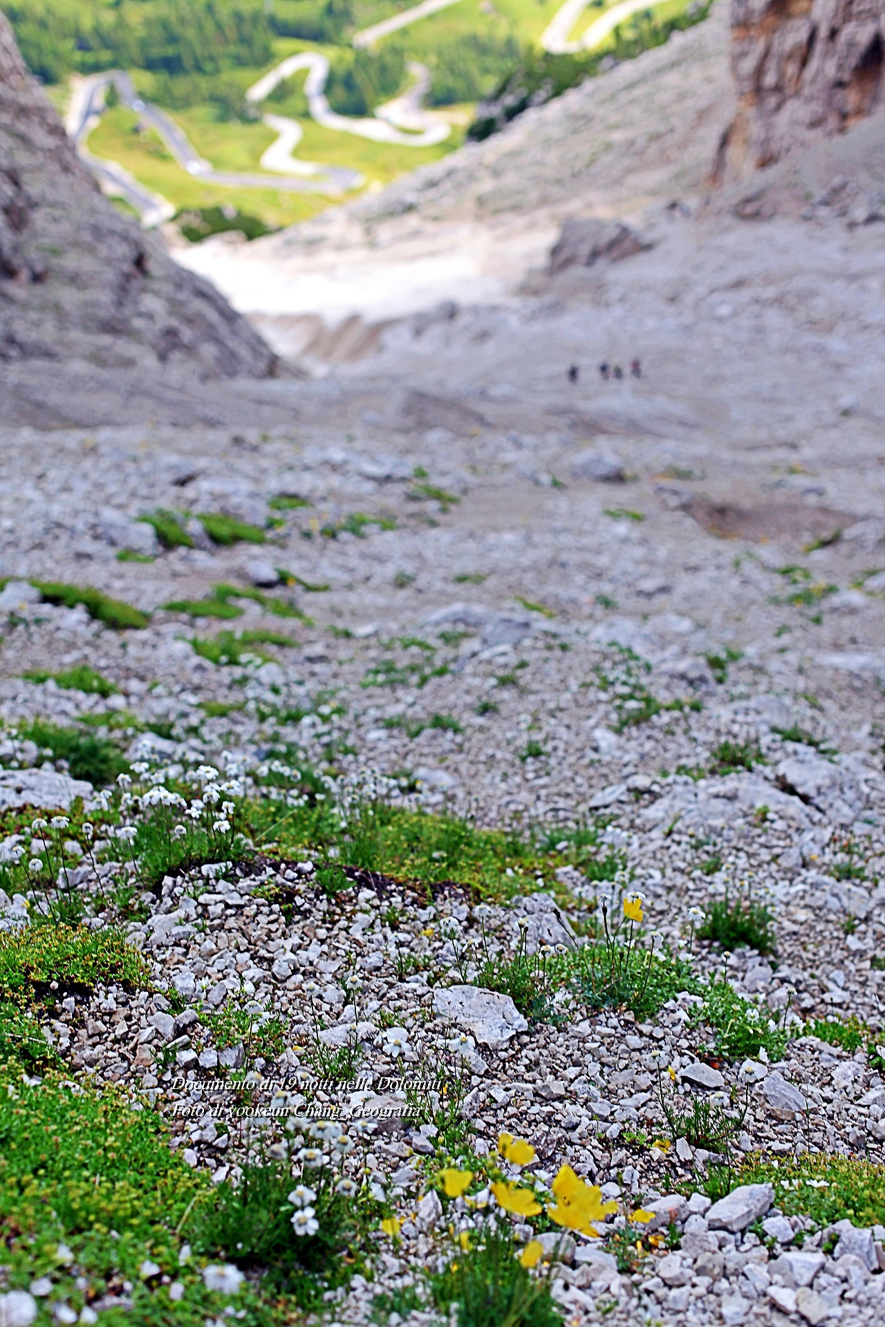 돌로미티를 이루고 있는 거대한 석벽과 풀꽃들..!