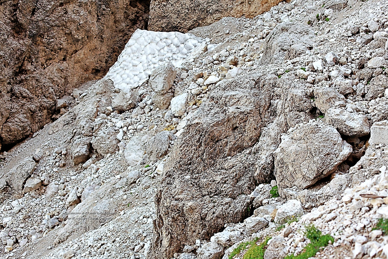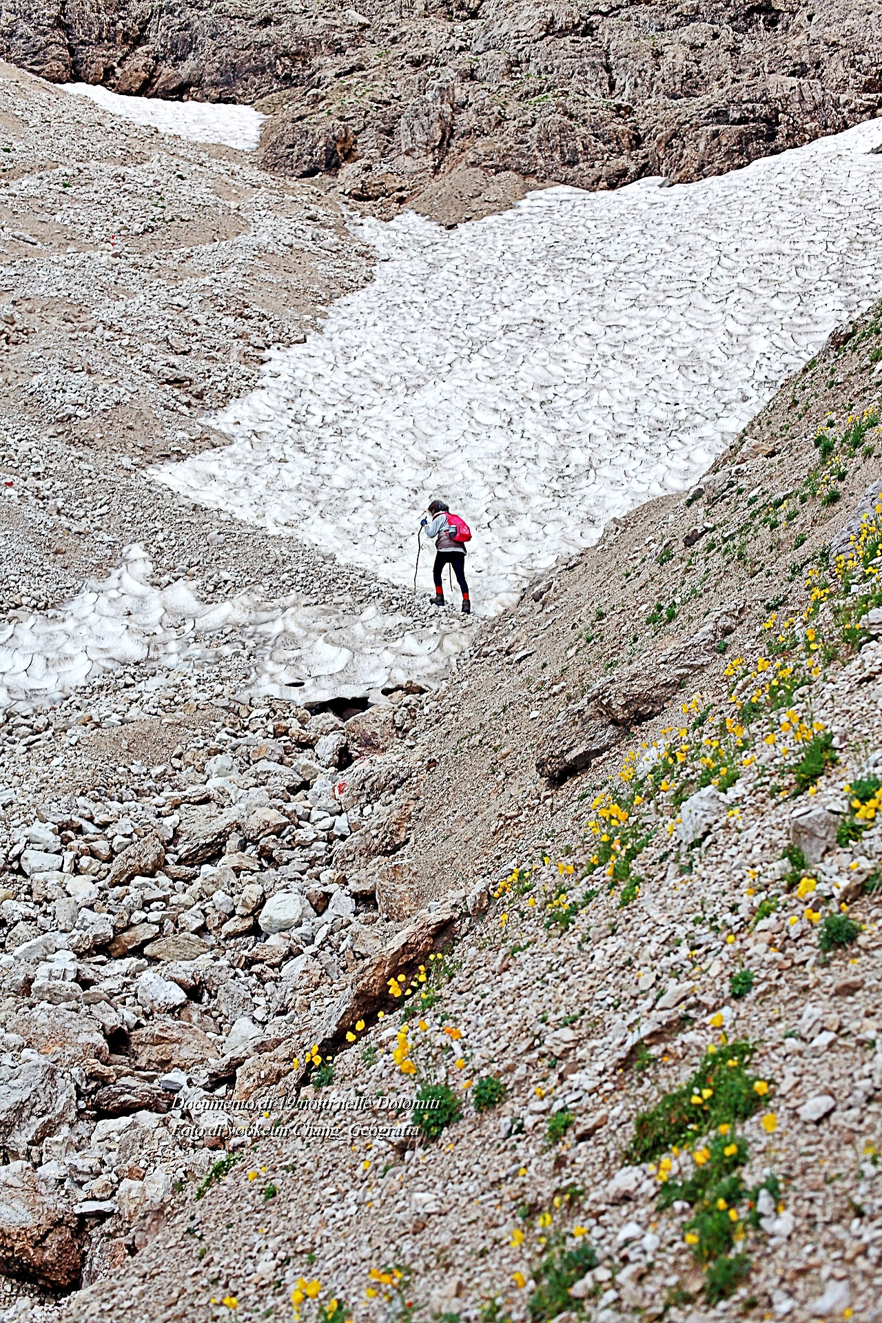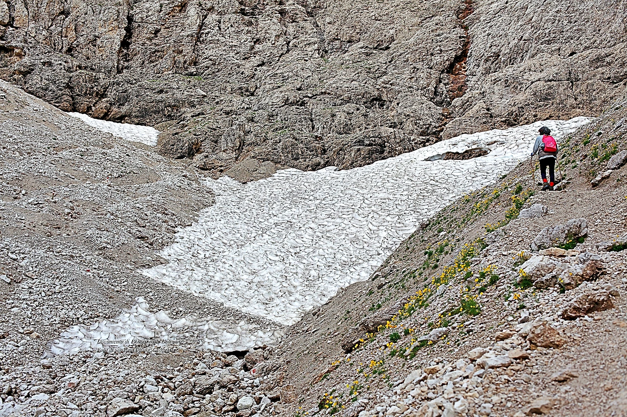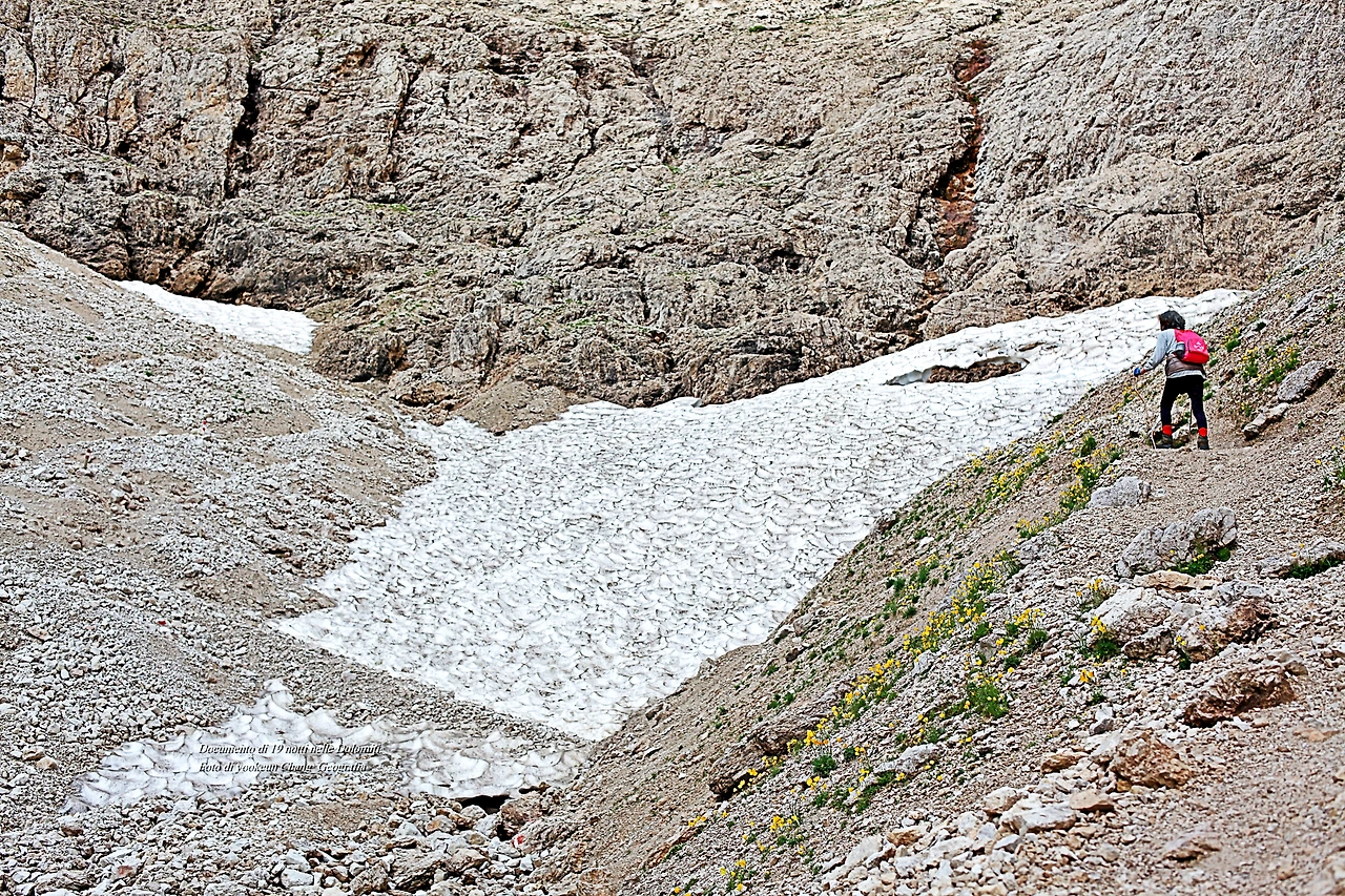 그리고 또 하나의 진풍경.. 지난겨울에 내린 새하얀 눈이 점점 더 색이 바래 누런 얼음덩어리로 남아있는 것이다. 돌로미티를 빛내는 아름다운 풍경은 거대한 바윗덩어리가 아니라 지난겨울의 흔적과 풀꽃이 생명력을 더해주고 있었던 것. 돌로미티의 진정한 속살이랄까..
