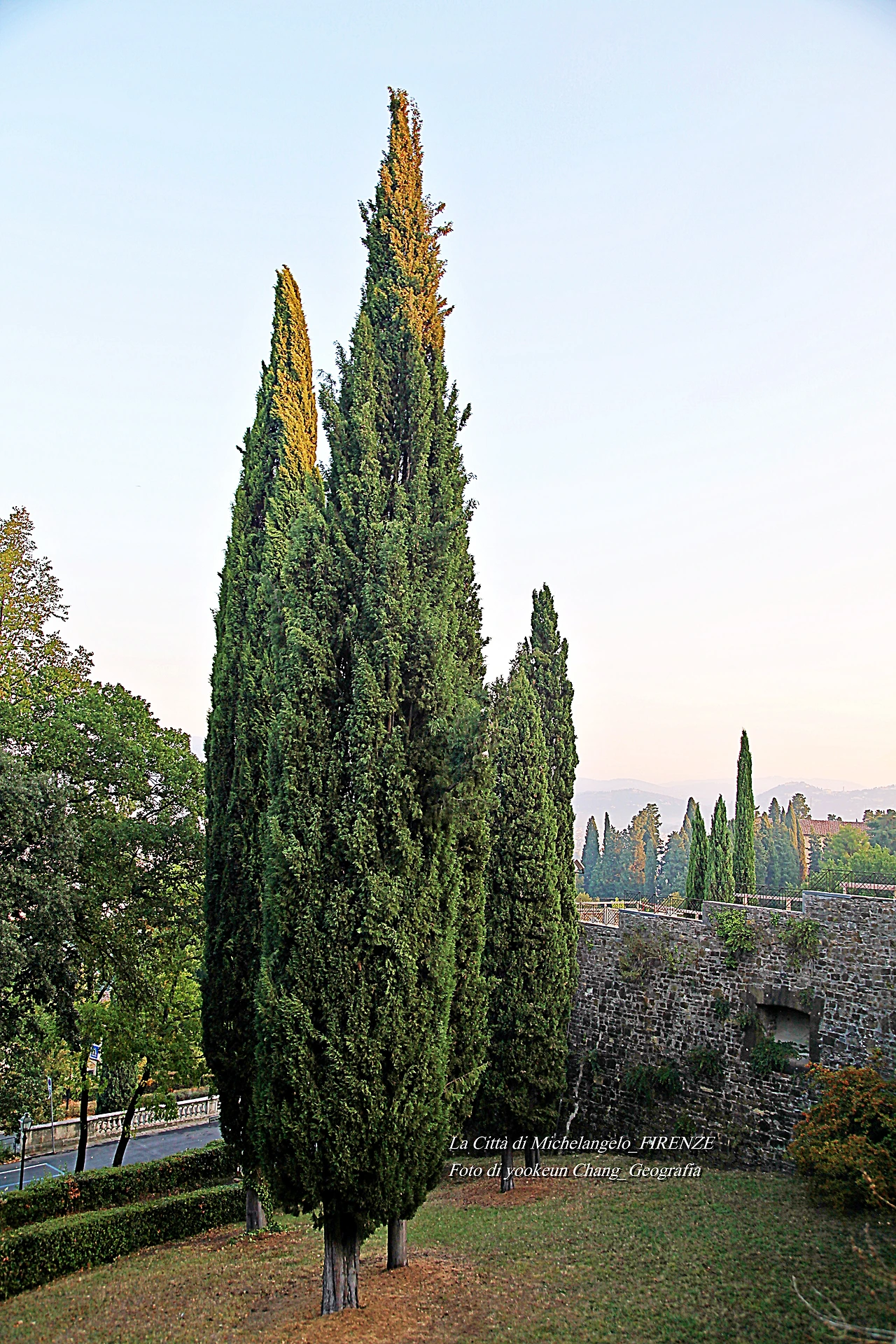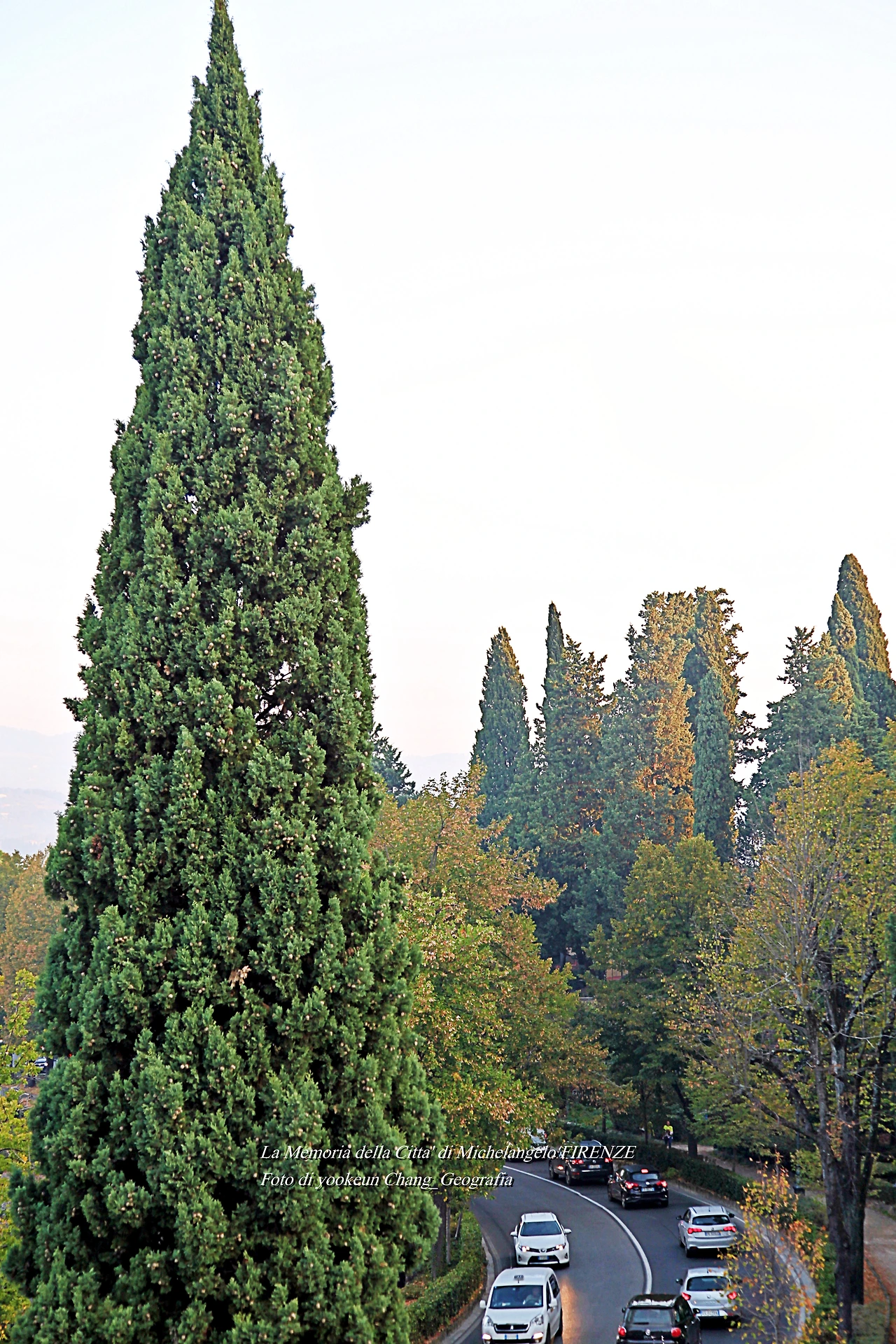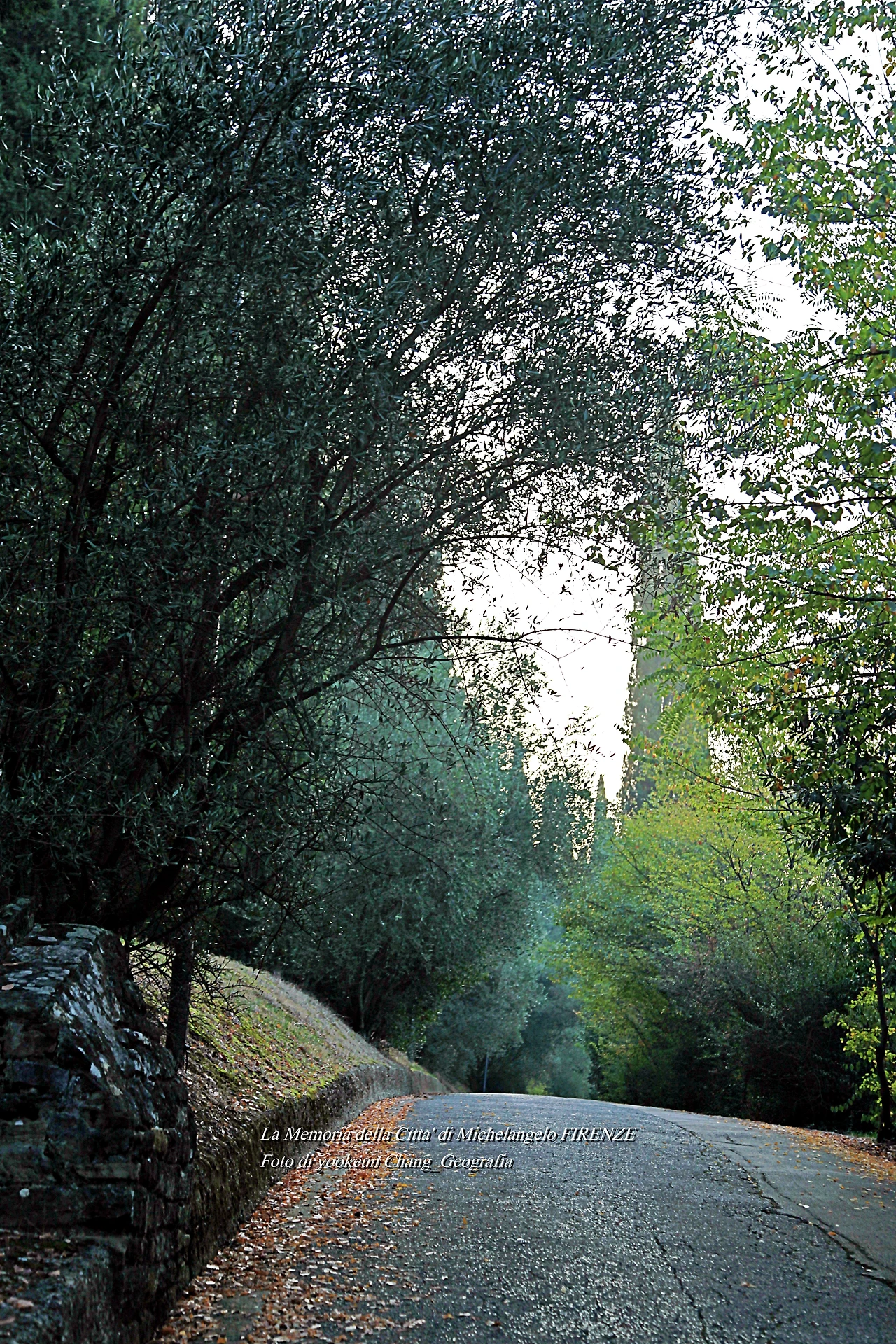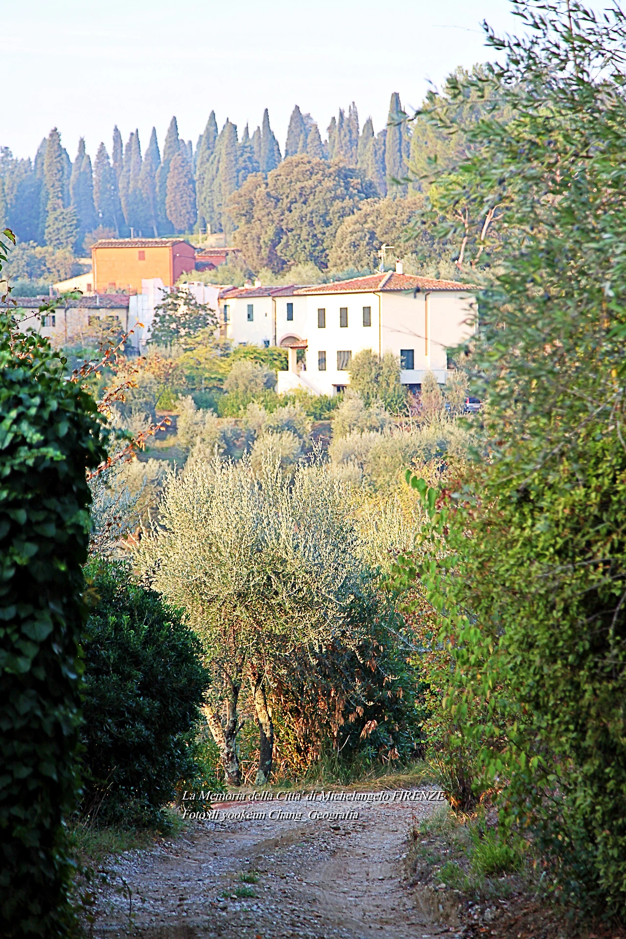 우리는 생각보다 발도장을 빨리 찍은 것 같다. 어느새 피렌체 시 외곽의 뷔알레 미켈란지올로(Viale Michelangiolo)로 빠져나오고 있었다. 아침햇살이 토스카나의 숲을 환하게 비추고 있는 곳. 그곳에는 무수한 사이프러스가 서 있었다. 만약 우리가 저곳을 벌건 대낮에 걸었다면 공포심은 덜하거나 없었을까.. 올리브 과수원에는 올리브가 까맣게 익어가고 있었다.