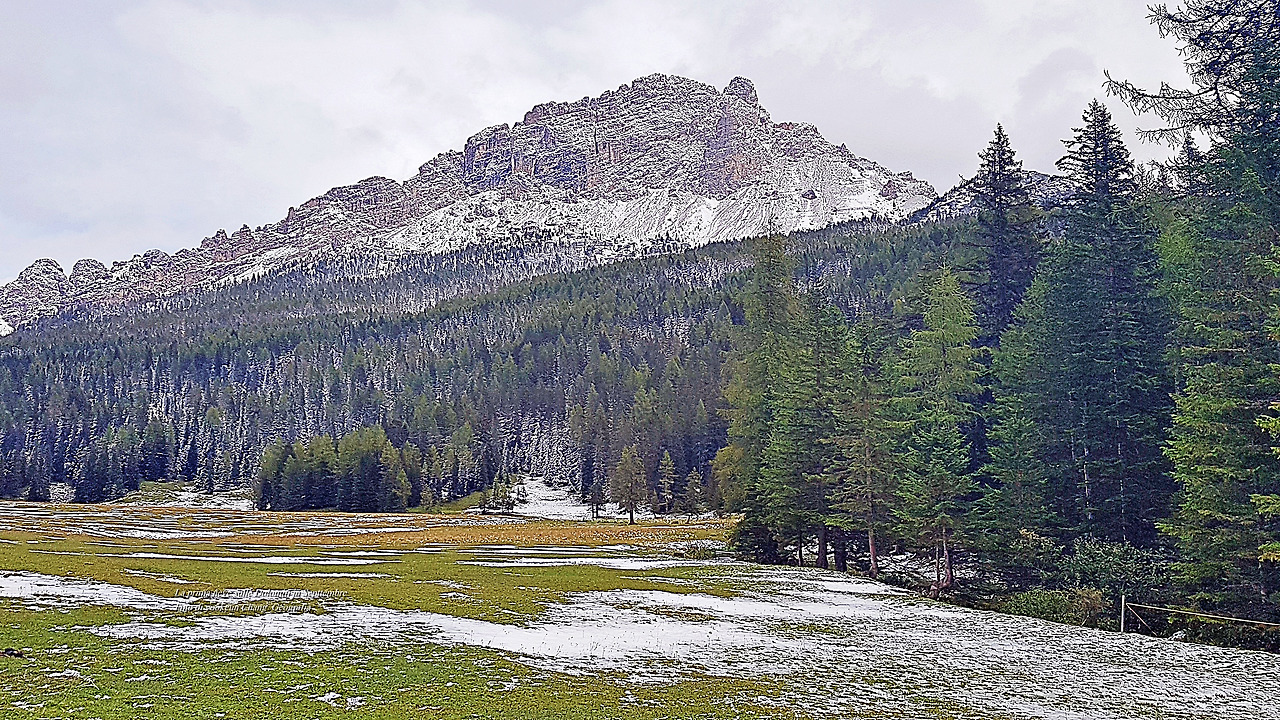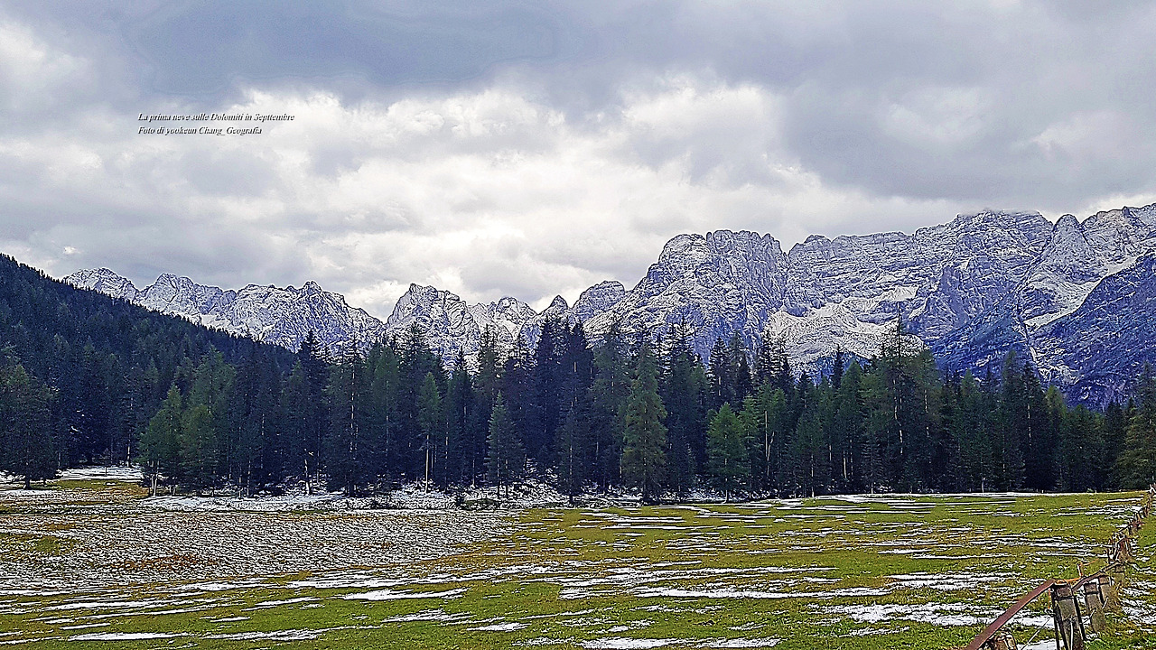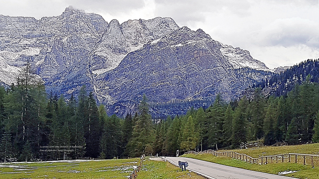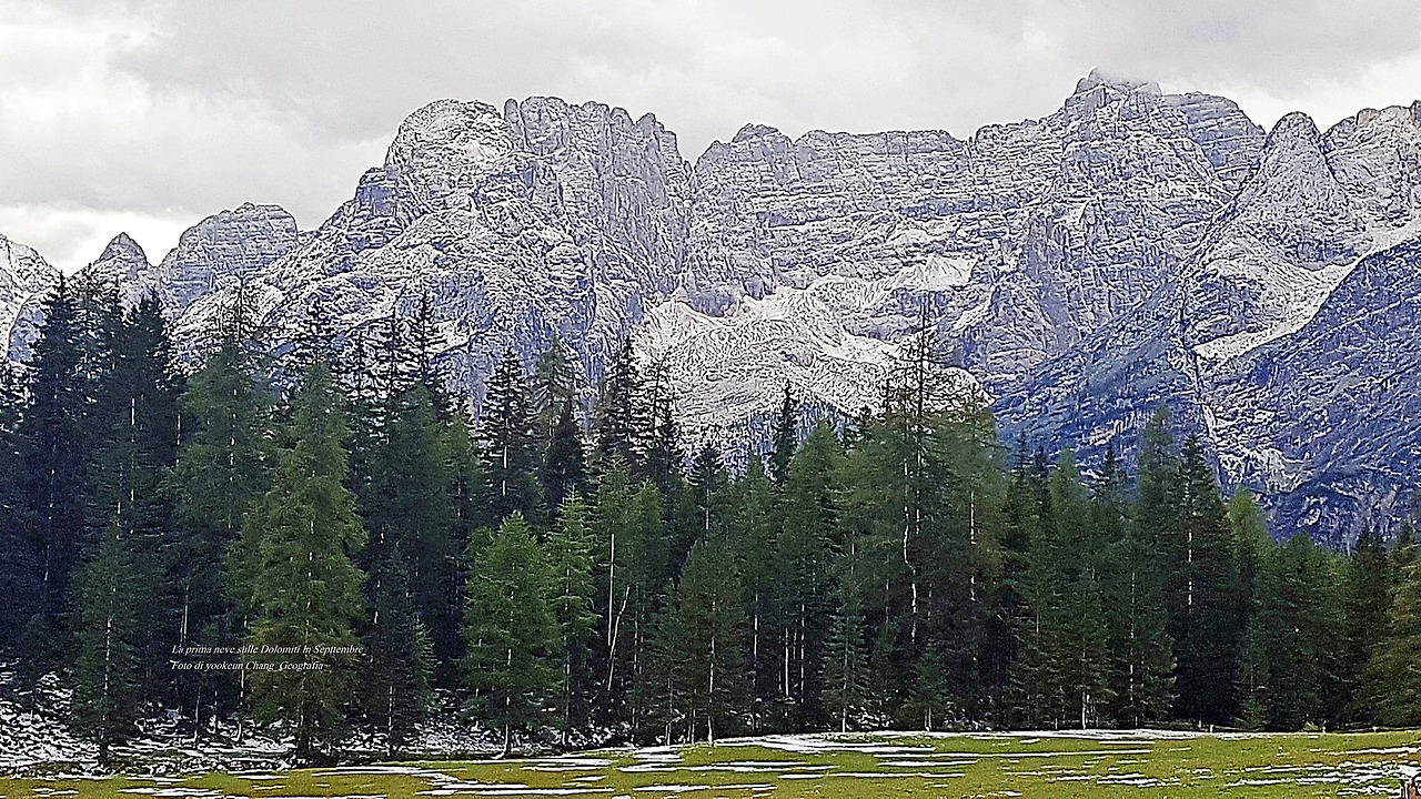 위 자료사진은 가을맞이를 하려던 돌로미티 산군에 갑작스럽게 첫눈이 오시는 바람에, 가을도 겨울도 아닌 어정쩡한 풍경이 연출되고 있는 것이다. 그러나 그 풍경은 처음 보는 풍경이자 가슴에 품고 있었던 내가 꿈꾸던 그곳이었다.