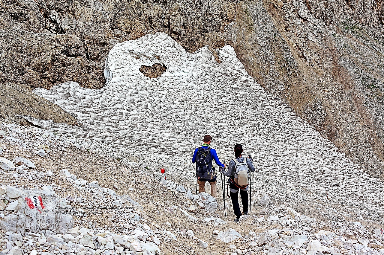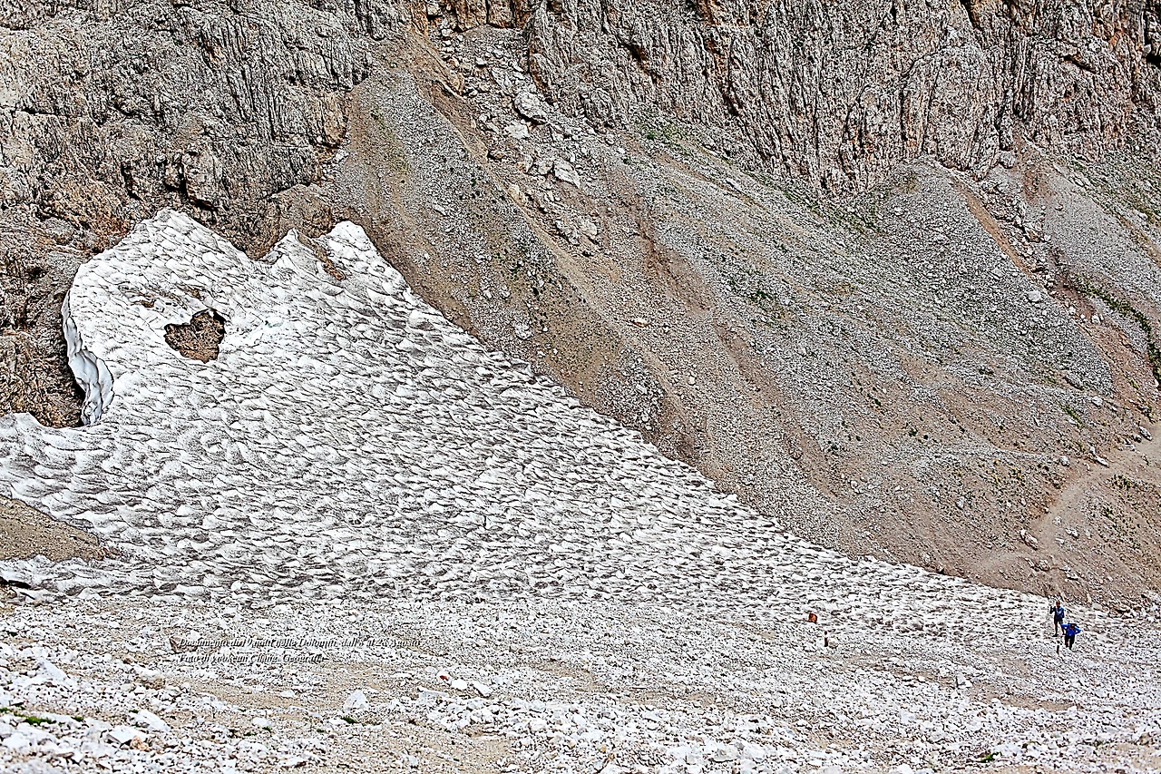 뒤를 돌아보니 우리가 지나왔던 길은 거대한 돌더미에 가려 보이지 않고 겨우 코 앞만 바라보고 걸음을 옮길 뿐이었다. 지난겨울에 내린 돌로미티 만년설(?)이 우리를 빤히 올려다보고 있었다. 인간의 형상을 닮은 괴이한 형상의 만년설.. 고도를 올려보니 그의 입은 하트 모양이었다.