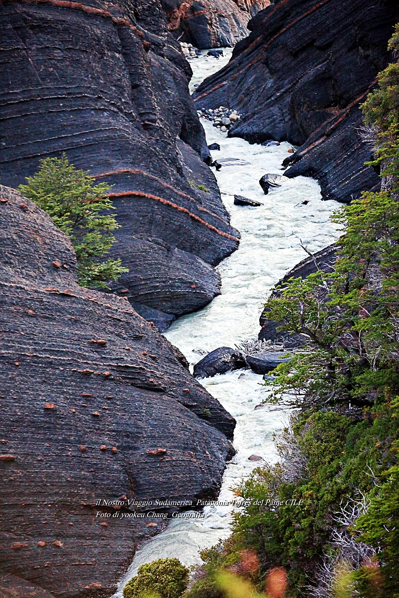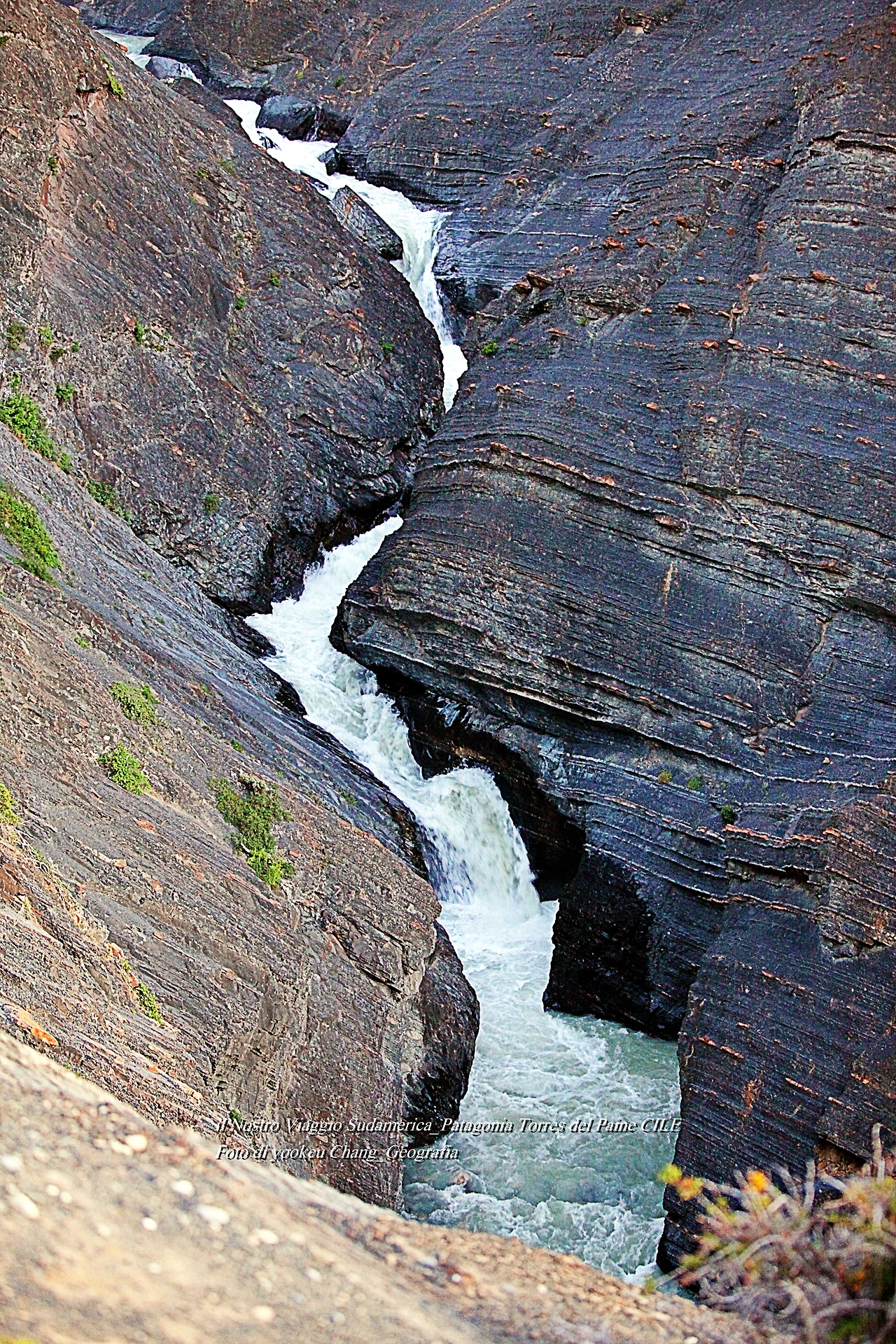브런치를 열면 빨간 파타고니아 베리가 눈길을 끄는 가운데 매우 특별해 보이는 계곡을 만나게 될 것이다. 또 억만 겁의 시간을 모두 박제해 놓은 듯한 거대한 바위 덩어리 속으로 매우 역동적인 물이 흐르고 있는 것을 볼 수 있다. 참 특별한 경험이었다. 켜켜이 쌓인 시간들 틈바구니에 무슨 전설이 새겨져 있는 것일까..