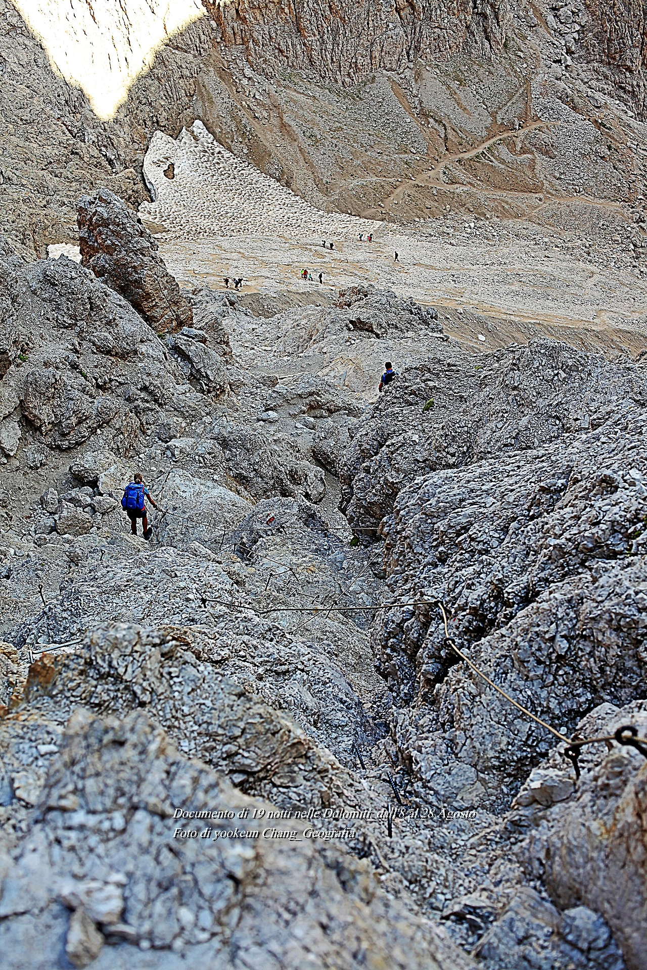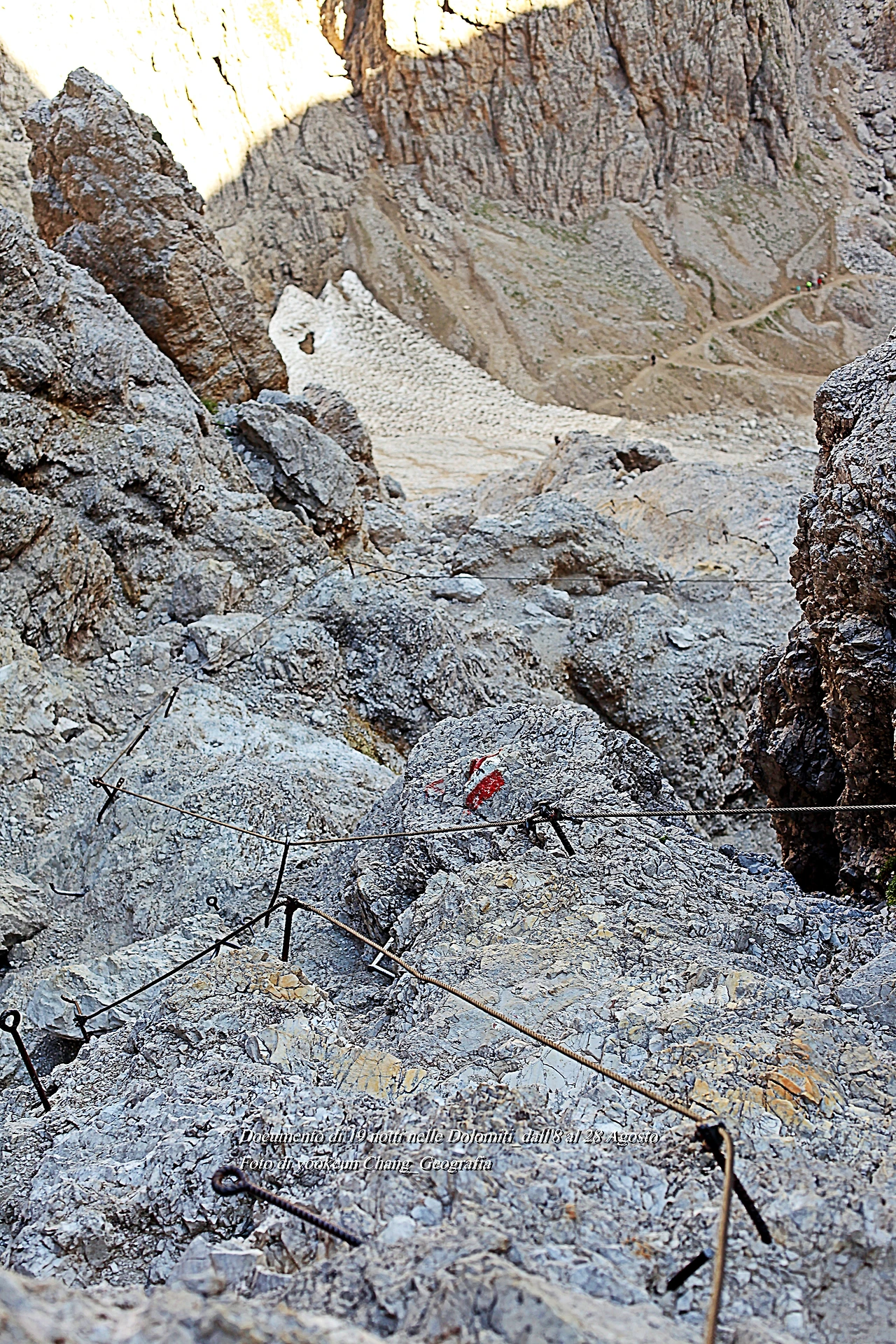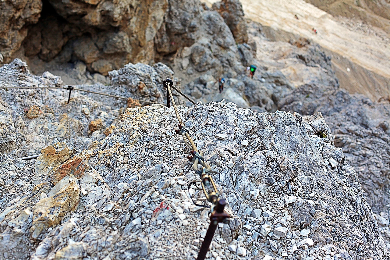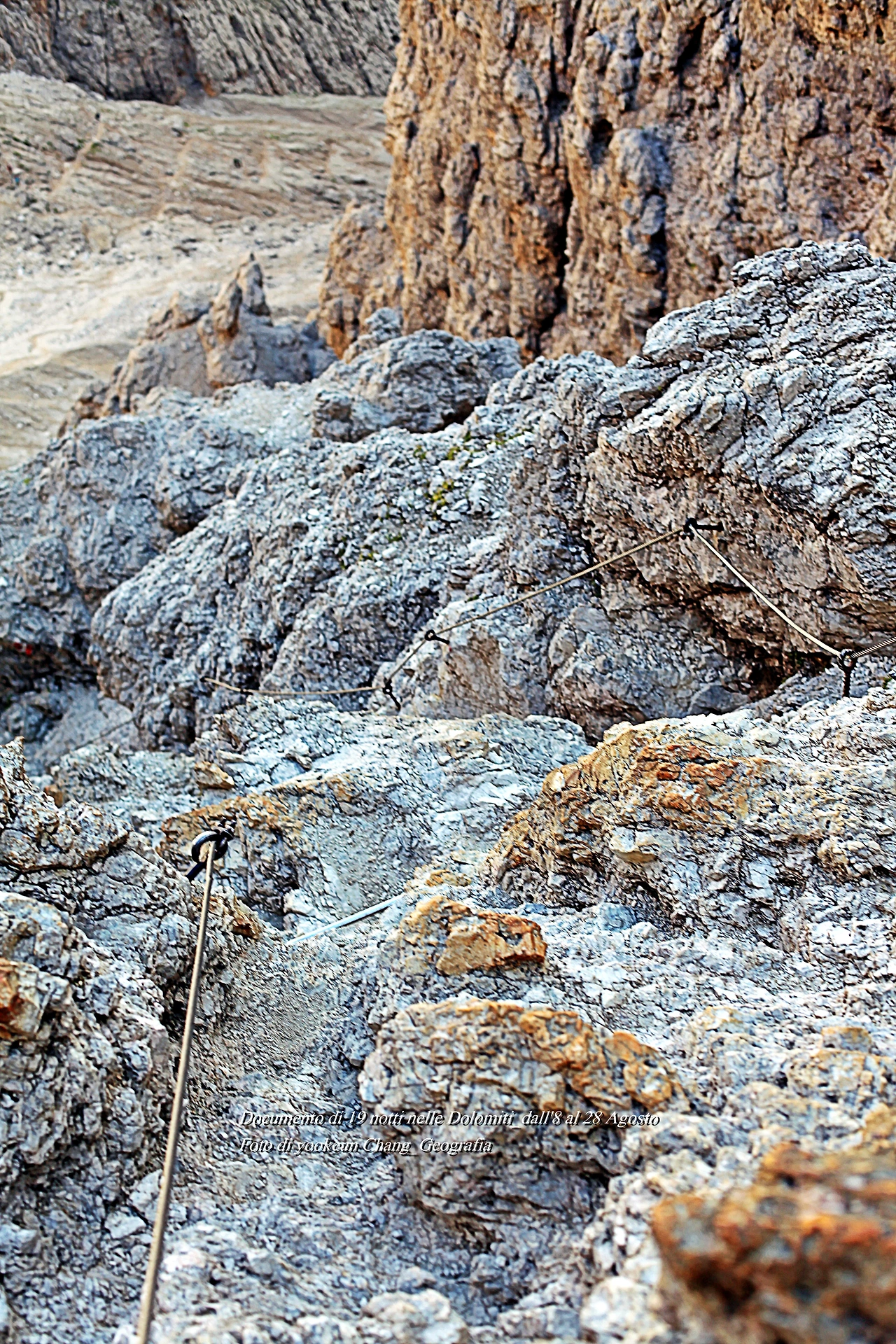 우리가 지나온 길이 위 자료사진에는 편평하게 보이지만 사진 뒤로 보이는 풍경을 참조하면 고도를 높일수록 점점 더 가팔라지는 모습을 볼 수 있다. 이 과정은 한 사람이 겨우 통과할 수 있는 좁은 길에 쇠줄을 걸어놓은 것이다. 쇠줄이 정상으로 가는 길이나 다름없는 곳이었다. 다시 뒤를 돌아보니 우리가 지나왔던 길이 까마득하게 보였다. 그땐 돌로미티 꽃양귀비가 우리를 마중하고 배웅해 주었다. 그런데 지금 우리가 발걸음을 옮기고 있는 곳은 울퉁불퉁한 바위가 전부였다.