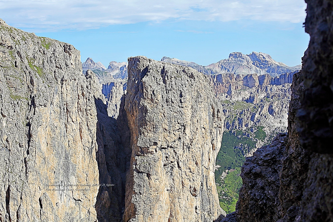 그런 반면, 힘껏 고도를 높인 바위틈에서 잠시 휴식 중에 바라본 돌로미티의 전경은 가히 절경이었다. 돌로미티로 떠나기 전 검색에서 열어본 어떤 사이트에서는 '돌로미티에서 태곳적 바다를 느껴보라'라고 했다. 어느 날 바다가 융기한 그곳에 우리가 발품을 팔고 있는 것이며, 그 이전에는 물고기들이 바닷속의 돌 틈을 비집고 다녔을까.. 우리는 머지않아 태곳적 바다속의 심연을 느끼고 있었다. 바다속이 허공에 돌출된 곳..!