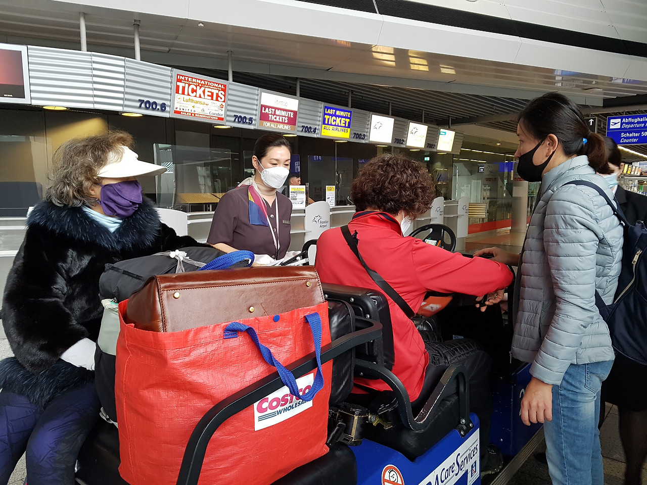서기 2020년 10월 25일 일요일 오후, 하니가 코로나를 피해 한국으로 떠나던 날 독일 프랑크 프루트 공항(Aeroporto di Francoforte sul Meno)에서 낯선 장면을 만나게 됐다. 골프장 가트처럼 생긴 작은 전동차에 두 사람이 타고 곁에는 배웅 나온 가족과 A항공사 직원과 가트를 운전하는 한 여성이 있다. 두 사람 중에 보라색 마스크를 낀 여성이 하니이며 동승한 분은 재독 교민인데 연세가 많으신 분이다. 이분은 A항공사의 노약자 서비스를 신청해 출국장까지 안내인의 도움을 받으며 탑승을 할 것이다. 다행이었다.
