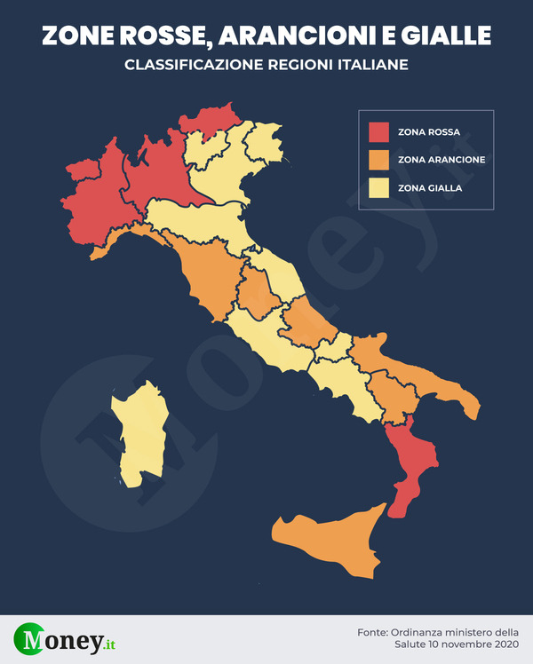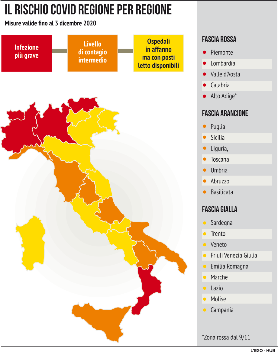 주재국 정부는 2020.11.10(화) 보건부령을 통해 볼싸노(Provincia di Bolzano) 지역을 Zona Rossa(Red Zone)로 지정하고, 리구리아, 토스카나, 아브루초, 움브리아, 바실리카타 주를 Zona Arancione(Orange Zone)로 추가 지정하였습니다. 동 조치는 11.11(수)부터 유효하며 새로운 코로나 지역별 방역 등급은 아래와 같습니다.