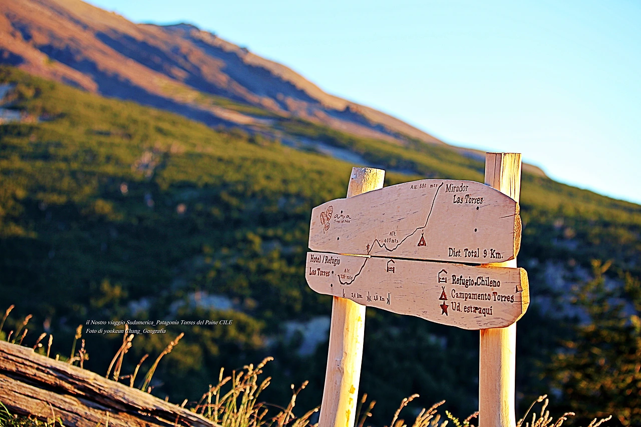 하니와 나의.. 길 위에서의 대화는 이렇게 파타고니아 여행이 끝날 때까지 계속됐다. 가까워지면 멀어지고 다시 또 추월하고.. 우리는 이른 아침 야영장을 출발하여 어느새 한 능선을 코 앞에 두고 있었다. 이정표에는 별표를 해 놓고 "당신의 위치는 여기"라고 적어두었다. 갈 길은 멀었지만 하루 한 차례 빚어지는 장엄한 일출의 장관은 금세 사라질 것이다. 참으로 위대한 조물주의 우주쇼.. 그를 통해 우리 행성에 매일 아침 쌓아둔 시간을 계수하게 된다. 우리는 그 시간 끄트머리에 매달려 희로애락, 생로병사 타령을 하며 살아왔던 것이다. <계속>