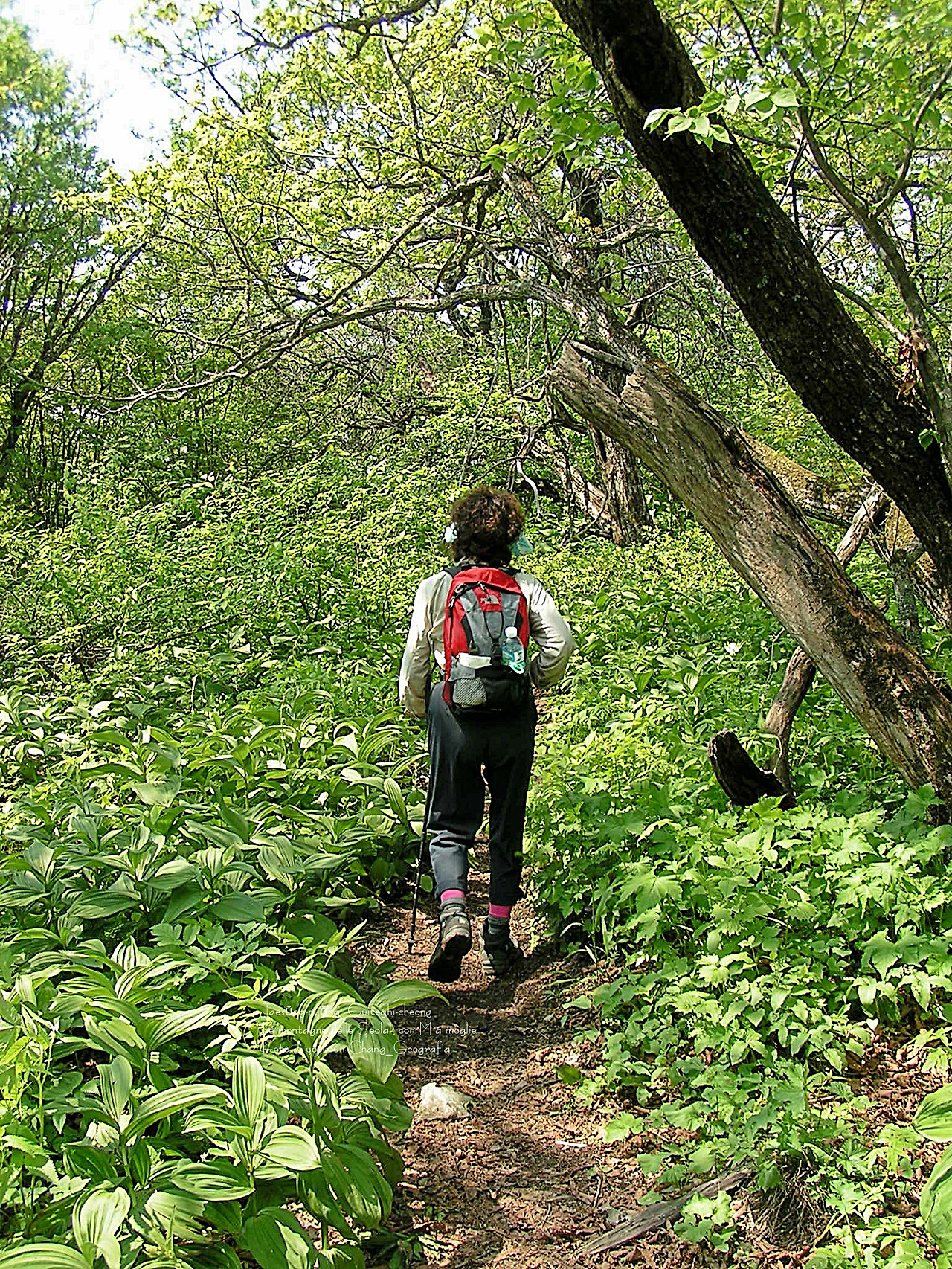 지금부터는 서북능선을 따라 쉬지 않고 걸어야 한다. 서북능선은 능선의 거리만도 18km에 9시간이 소요되는 곳. 등정과 하산을 포함하면 대략 13~16시간이 소요되는 매우 힘든 코스이자 지형이다. 또 능선이 길면서도 굴곡이 심해 체력 소모가 심하고 강인한 인내심을 요하는 곳이기도 했다. 이렇게 힘든 산줄기를 걷는 동안 한여름의 더위와 싸워야 하는 것이다. 그 깊은 산중에 아내와 나 단 둘 뿐이었다.