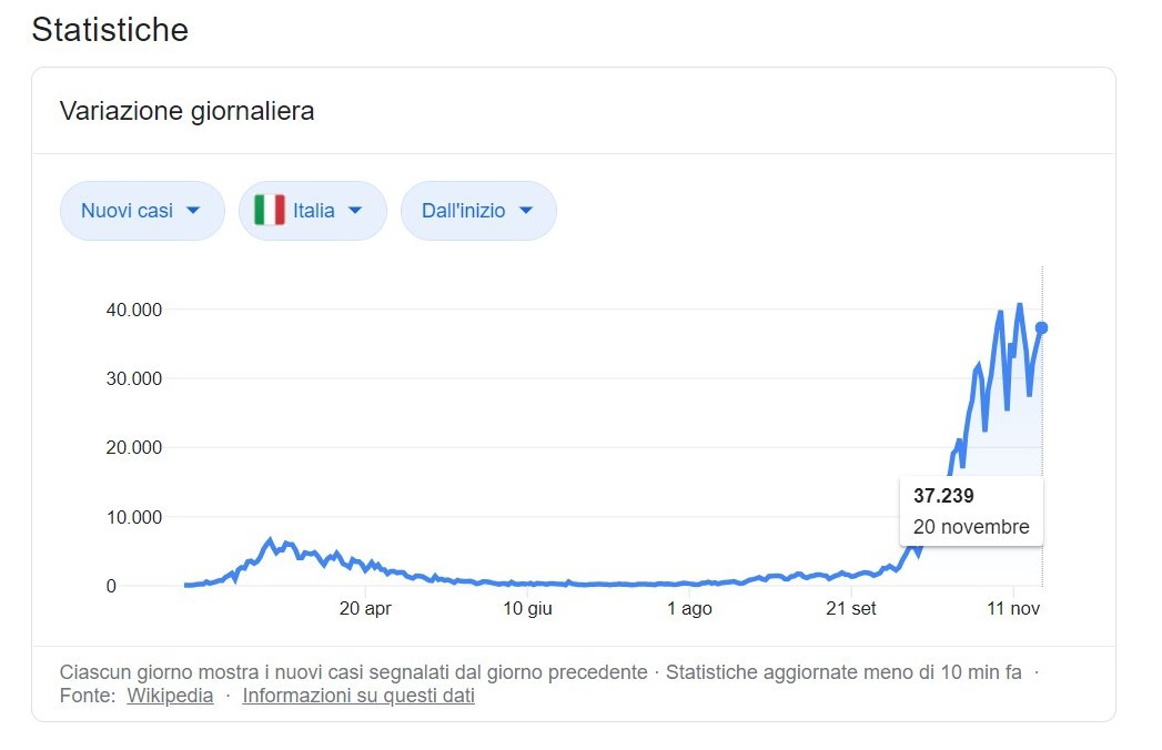 이탈리아는 물론 유럽과 미국 등지의 코로나 19 성적표는 시쳇말로 개죽쑤는 꼴로 대책이 없다. 현재 이탈리아 코로나 19 관련 소식은 참혹 그 자체이다. 오늘자(20일, 현지 시각) 코로나 19 집계표는 감염자 37.242명에 사망자 수만 699명에 이른다. (Le ultime notizie sul Coronavirus in Italia, i dati e le news dal mondo di venerdì 20 novembre. 37.242 nuovi contagi e 699 morti per Covid in Italia.) 대한민국에서는 상상 조차 하지 못할 감염자 수와 사망자 수이다.