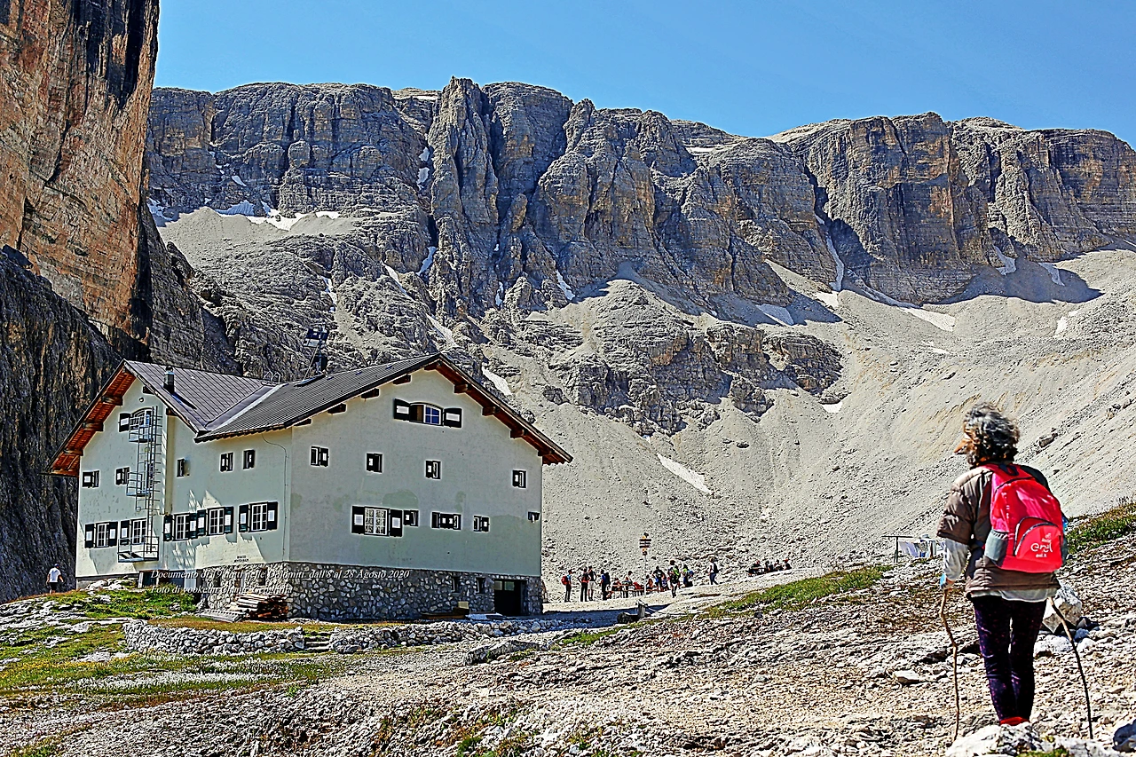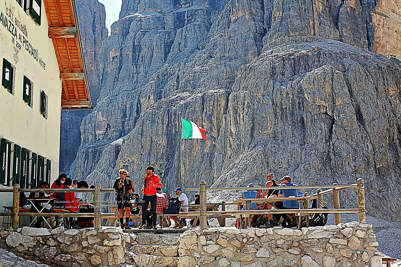 마침내 하니와 실랑이를 벌인 곳에 당도했다. 그곳에는 리푸지오 삐쉬아두(Rifugio F. Cavazza al Pisciadù Hütte)의 로지가 있는 곳이며 로지 벽에는 이곳이 해발 2,587미터라고 써 두었다. 힘들게 이곳까지 진출한 사람들은 로지에서 커피를 마시거나 요기를 하곤 했다. 바람은 살랑거리고 하늘빛은 이탈리아 아주리 군단 유니폼(Nazionale di calcio dell'Italia)의 색을 쏙 빼닮았다.