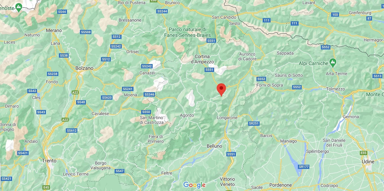 지도에 쓰여있는 지명을 자세히 살펴보면, 현재 위치 주변으로 돌로미티의 명소가 즐비한 가운데 벨루노(Belluno)와 아우론조 디 까도레(Auronzo di Cadore), 꼬르띠나 담빼쬬(Cortina d'Ampezzo)를 확인하실 수 있을 것이다. 그리고 지도 좌편(서쪽으로) 볼싸노(Bolzano)와 뜨렌또(Trento)가 확인될 것이다. 그곳은 이탈리아 지도를 펴놓고 보면 베네토 주(Regione del Veneto)로부터 북서쪽과 북동쪽으로 돌로미티가 넓게 분포된 곳이며, 뜨렌티노 알또 아디제 주(Trentino-Alto Adige)와 맞물려 있는 곳이다.