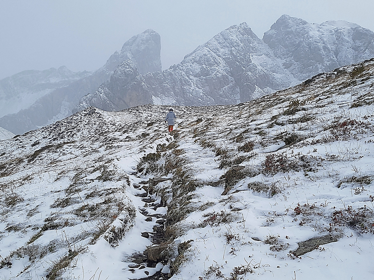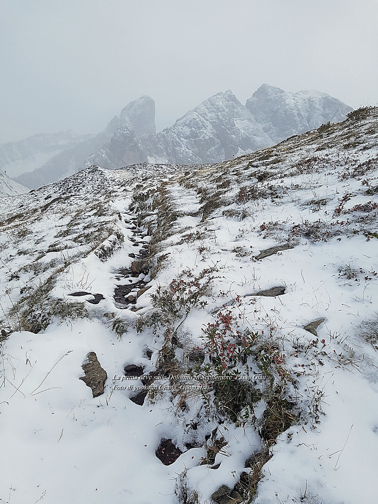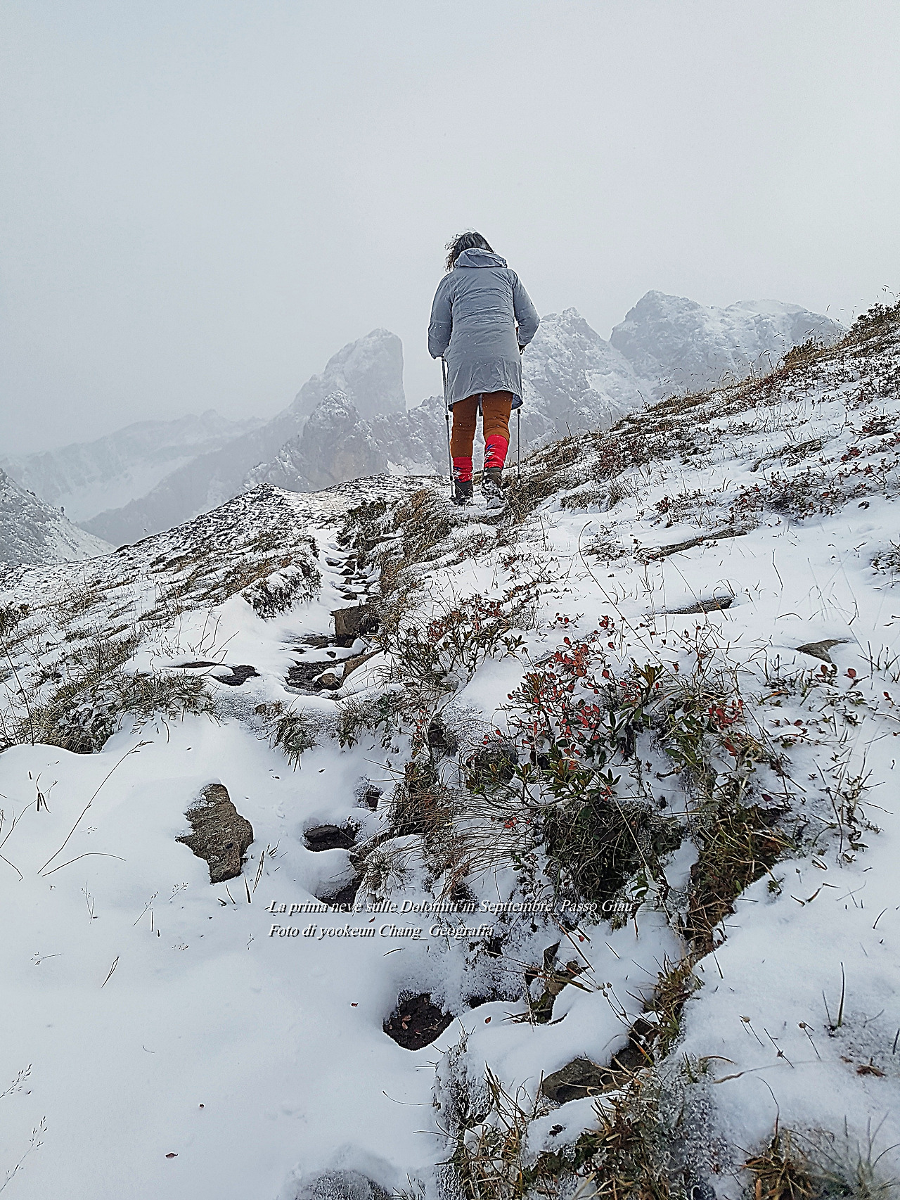 우리는 빠쏘 디 지아우 고갯마루에 도착하자마자 주차를 해 놓고 장비를 챙기기 시작했다. 신발은 등산화를 챙겨 신고 스틱을 챙겼다. 진눈깨비가 날리고 있었다. 우리는 곧바로 지난여름의 추억이 남아있던 장소로 천천히 걸음을 옮겼다. 드넓은 평원처럼 펼쳐진 고갯마루는 나지막한 구릉지대로 형성된 곳으로 눈이 덮여 좁은 오솔길이 드러나지 않았다.