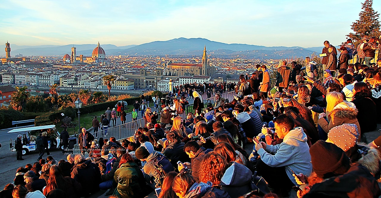 그런 다음 그곳에서 조금만 발품을 더 팔면 미켈란젤로 광장에 도달하는 것이다. 해 질 녘 그곳은 북새통을 이룬다. 피렌체를 찾은 사람들이 광장 한쪽에 마련된 계단에 앉아 일몰에 비친 고도와 황홀한 일몰을 구경하기 위해 모여든 것이다. 아마도.. 피렌체를 찾은 관광객들 다수는 이런 경험이 있을 것이다. 우리 또한 그랬으니 말이다.