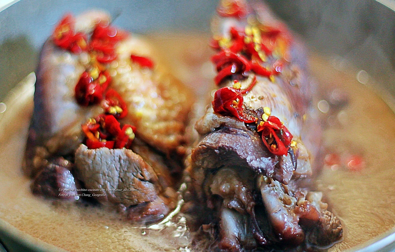 리체타는 간단했다. 약간 깊은 들통에 고기를 넣고 마늘 기름으로 잠시 겉만 익힌 후 적포도주를 고깃덩어리가 잡기게 붓는 것이다. 거기에 월계수 잎은 물론 향초 다발(부케가르니, Bouquet Garni)을 넣고 센 불로 가열하면, 포도주가 끓기 시작하는 즉시 약불로 낮추어 천천히 조리는 것이다. 그리고 뭉근하게 잘 익으면 건져내는 것. 그게 끝이었다. 본문에 등장하는 붉은 포도주와 매운 간장 양념으로 요리한 칠면조 리체타의 배경은 대략 이러하다.