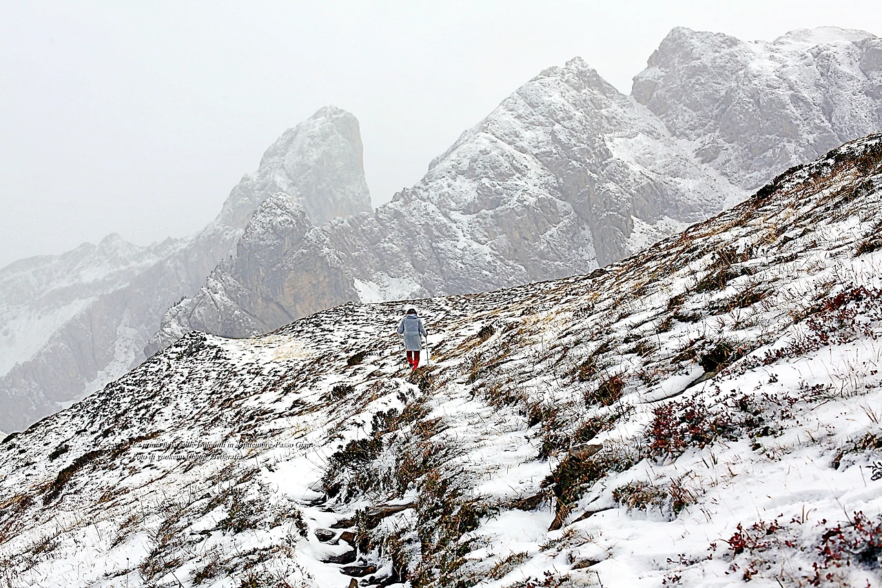 우리가 빠쏘 디 지아우 고갯마루에 도착했을 때 사람들은 고갯마루 근처의 능선을 배호하고 있었다. 이때까지만 해도 그들의 정체를 알 수 없었다. 그저 돌로미티에 첫눈이 오신 날 트래킹에 나선 사람들 쯤으로 여겼다. 그런데 나중에 알고 보니 그들은 포토그래퍼 혹은 방송사의 카메라 기자였다. 첫눈이 내린 이곳의 풍경을 담기 위해 멀리서 한 걸음에 달려온 사람들이었다. 처지는 서로 달랐지만 우리와 별반 다르지 않았다. 우리는 어느 날 치비아나 골짜기에서부터 지남철에 끌린 듯 이곳까지 오게 된 것이다. 첫눈이 안겨준 마법이었던 것이다.