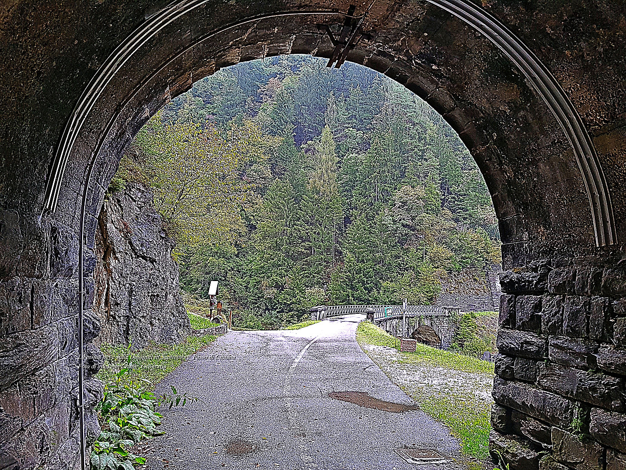 굴다리 위에서 바라본 골짜기의 풍경은 아름답기도 했지만 터널 속을 들어가 볼 생각 때문에 을씨년스럽기도 했다. 아무도 없는 낯선 곳. 비가 추적추적 내리시는 날.. 하니는 차콕을 하고 있고 나 혼자 어둠이 깃든 터널 속으로 들어가 본다..? 흥미롭기고 하고 약간은 켕기는 분위기..