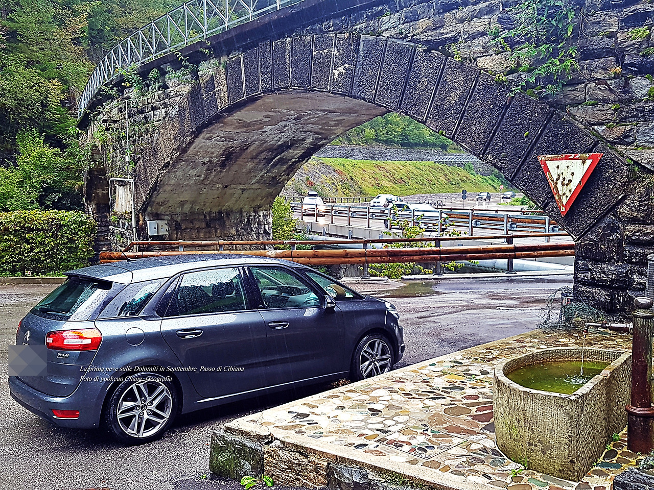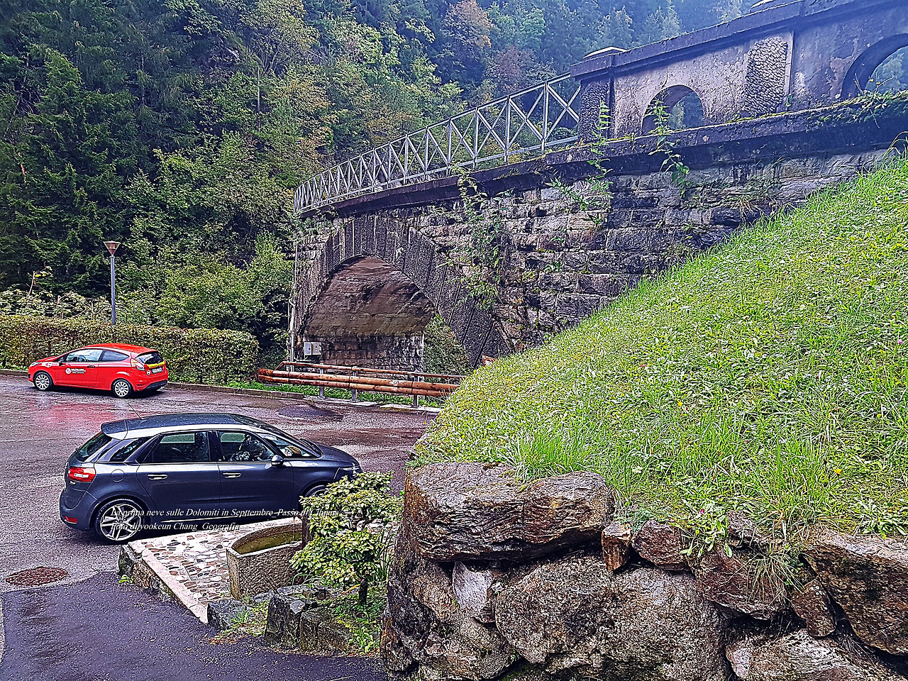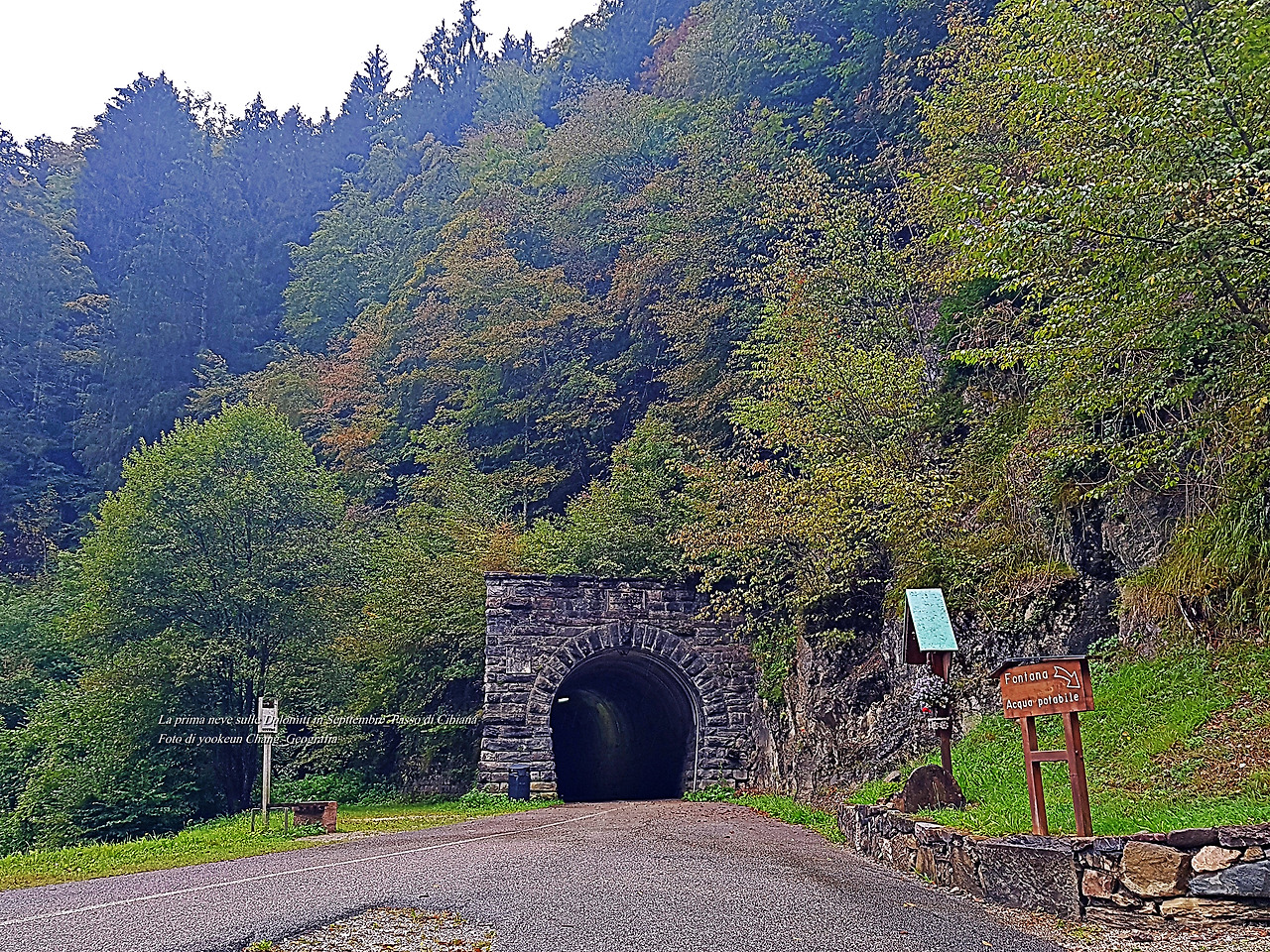 그리고 다음 날 비가 개일 것 같았지만 여전히 비가 오락가락하며 시꺼먼 구름들이 산등성이를 넘나들고 있었다. 그런 잠시 후 우리는 치비아나 디 까도레(Cibiana di Cadore)로 이어지는 국도변의 굴다리(눈여겨봐 두시기 바란다) 아래에 자동차를 주차해 두고 차콕하며 쉬고 있었다. 그곳은 잠시 비를 피하기 쉬운 곳일 뿐만 아니라 곁에 맑은 물이 쉼 없이 흐르는 수도꼭지가 있었다. 컵으로 물을 받아 마시니 한 순간에 속이 말갛게 변하는 것. 하니가 차콕을 하는 동안 나는 주변을 둘러보기로 했다.