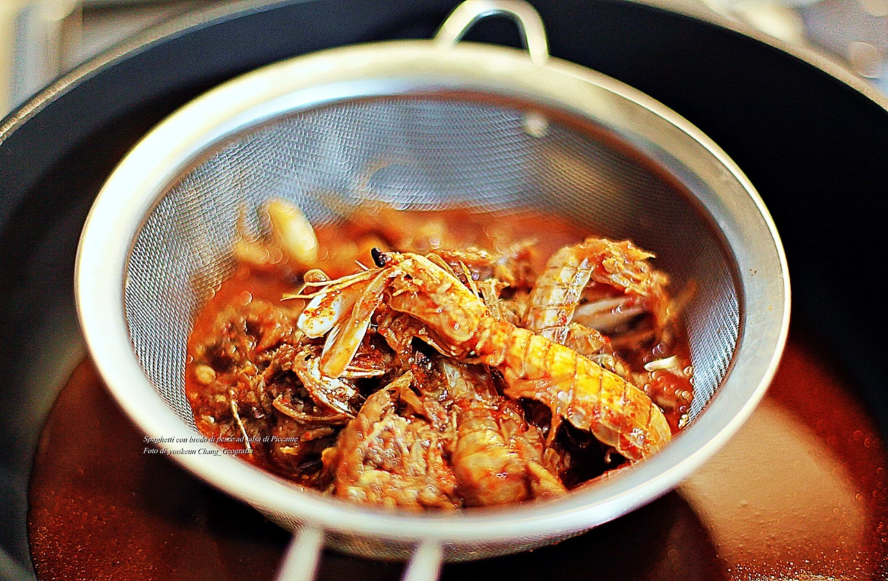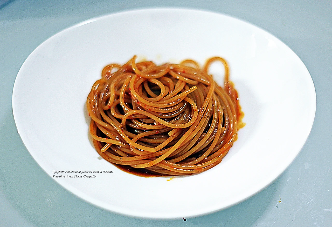 Spaghetti con brodo di pesce ad salsa di Piccante