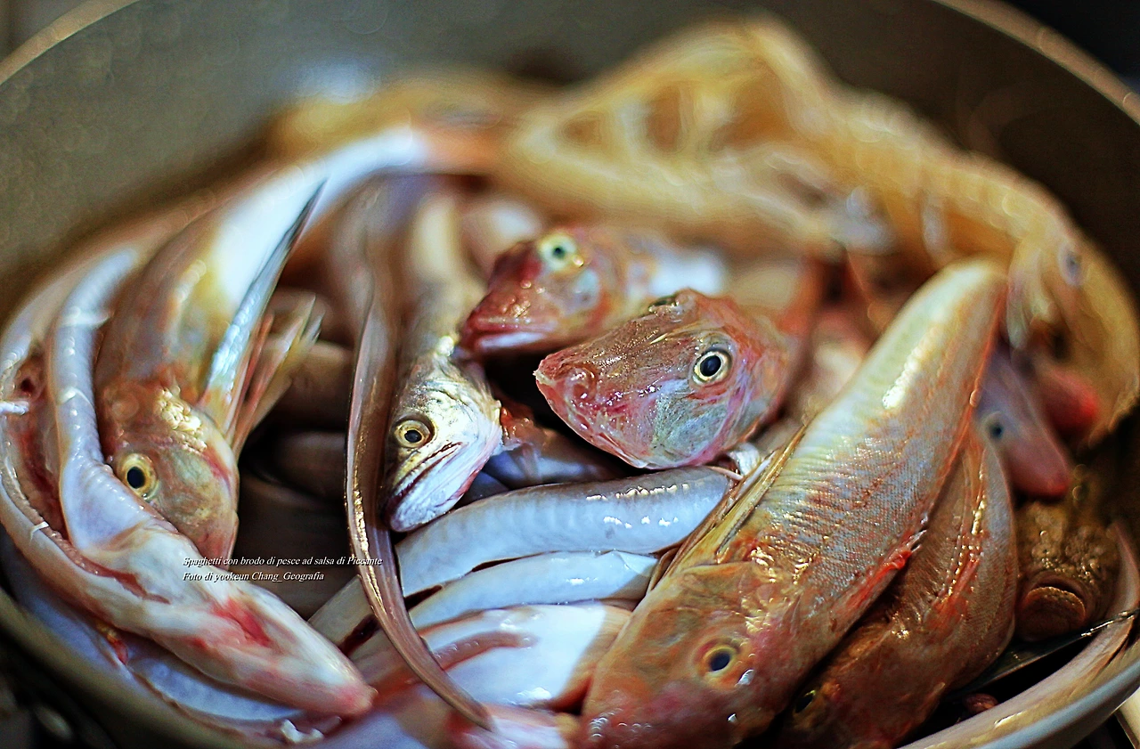 오늘 등장하는 생선 육수로 만든 매콤한 해물 스파게티 요리 리체타는 이들 뿔리에제(Pugliese_뿔리아 사람들)는 먹어보지 못한 요리이자 나의 창작품이다. 요리 절차는 매우 까다로울 뿐만 아니라 맛 또한 일품이다. 우리나라 입맛을 생각하며 만든 꼴라보라찌오네(Collaborazione, 합작) 요리인 셈인데.. 보통의 해산물 요리(Frutti di mare)는 어패류를 주로 사용하지만 본 리체타는 잡어를 이용했다. 생선들은 어느 날 바를레타 재래시장 어물전에서 싼값에 구입한 것으로 우리나라 매운탕을 떠올리며 요리에 들어간 것이다.
